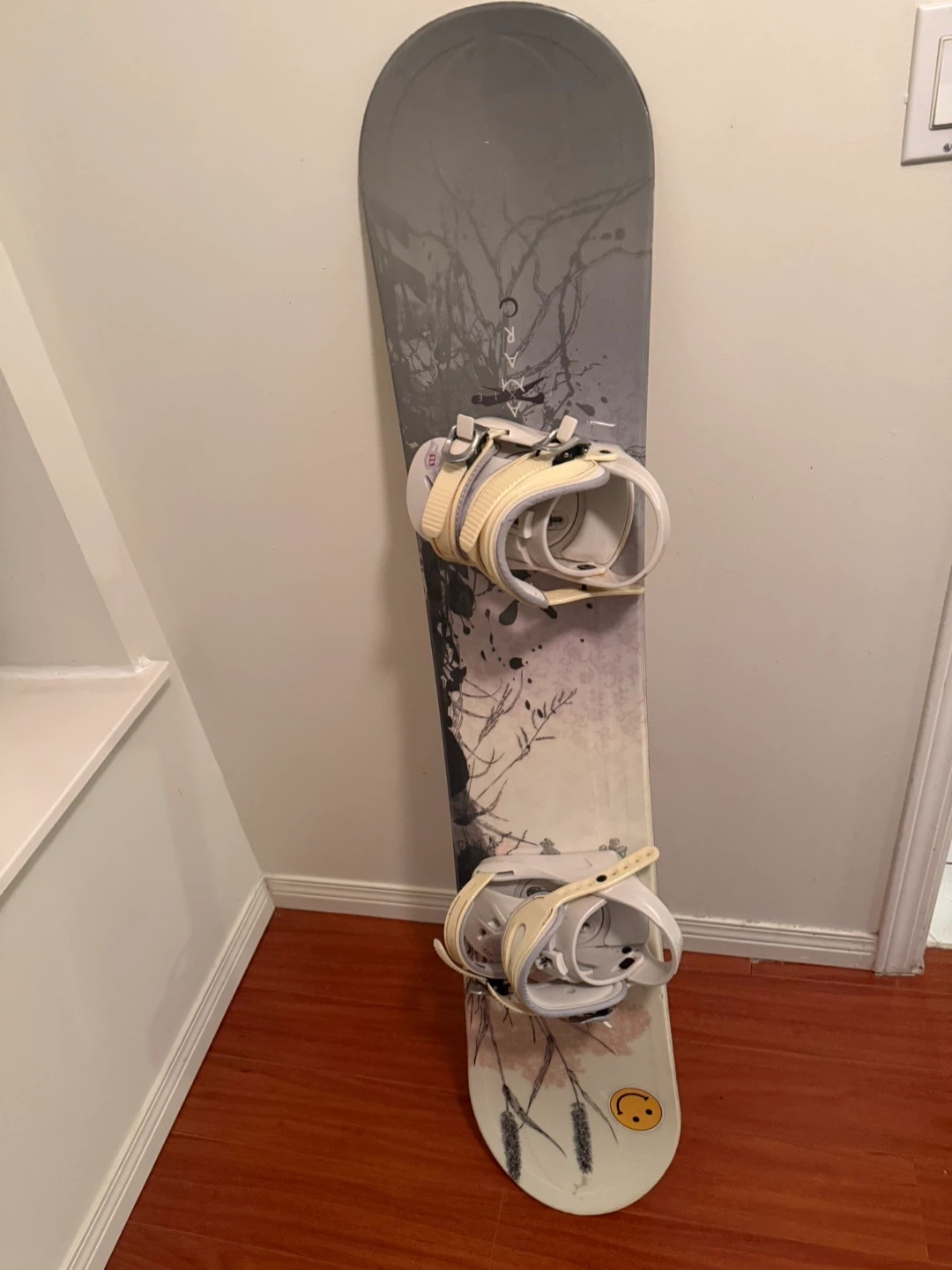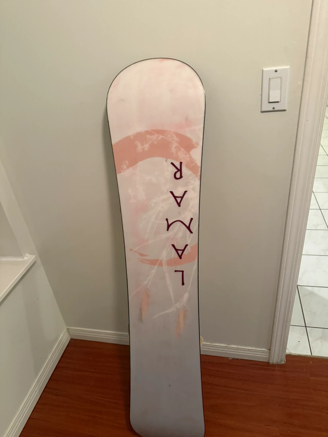 This is a Lamar snowboard with bindings attached. It has a pink and white design on top and a grey, white, and black design on the bottom. Perfect for hitting the slopes this winter! 141 cm