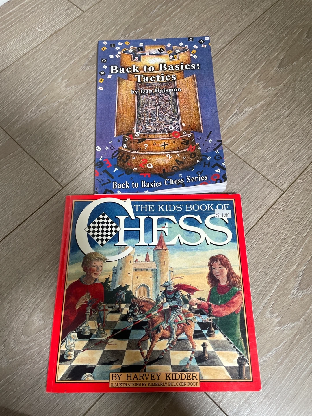 Two books on chess strategy and fundamentals. 'Back to Basics: Tactics' by Dan Heisman covers tactical play. 'The Kids' Book of Chess' by Harvey Kidder introduces the game. Great for learning chess!