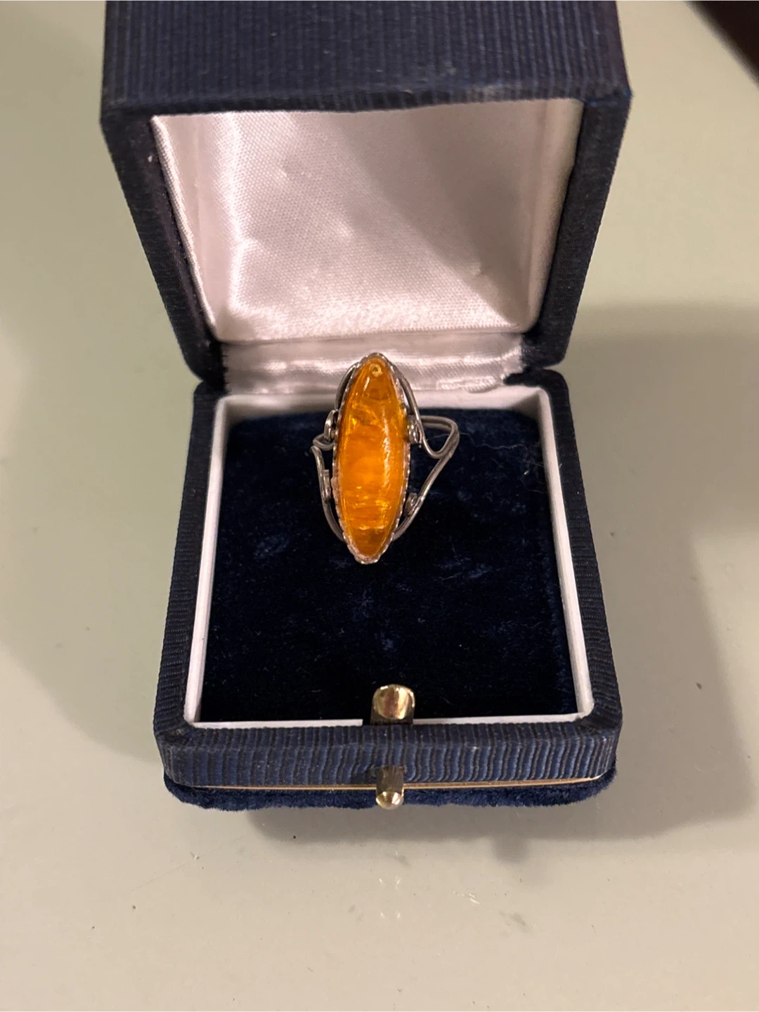 A vintage ring featuring a marquise-cut amber stone set in a decorative Sterling Silver band. It's presented in a navy blue velvet-lined presentation box, perfect for safekeeping or gifting. The ring's intricate setting complements the warm, honey-coloured amber. A lovely piece for special occasions!