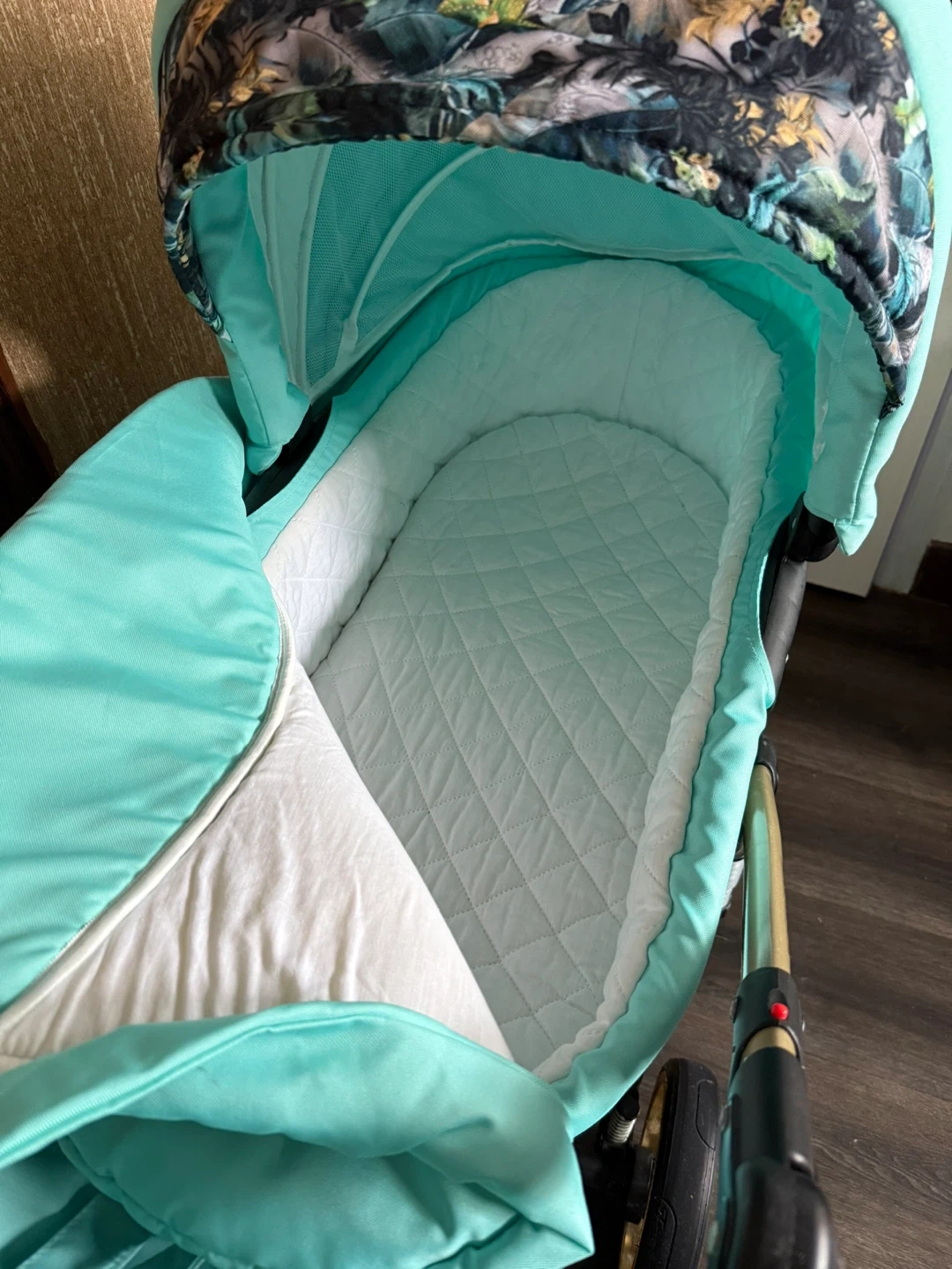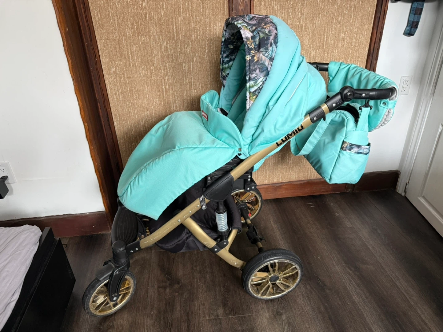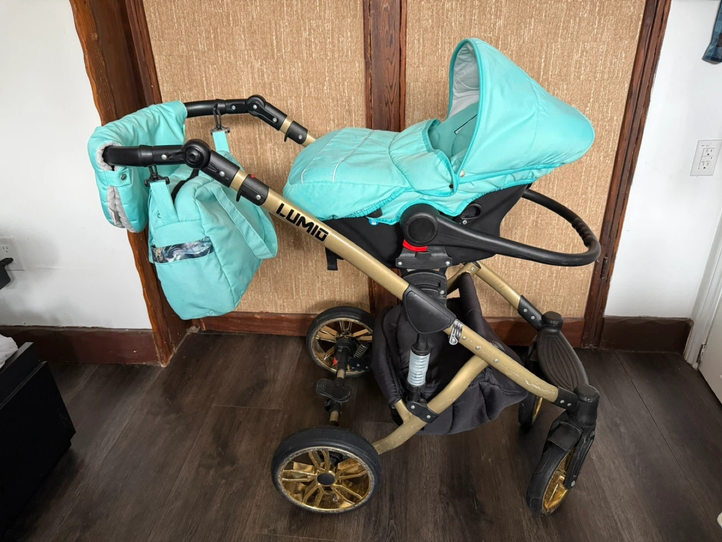 This Lumio baby stroller system comes in a mint and gold colour. It includes a bassinet, a car seat, and a stroller seat, along with a matching diaper bag. The stroller is designed for easy folding and transport.