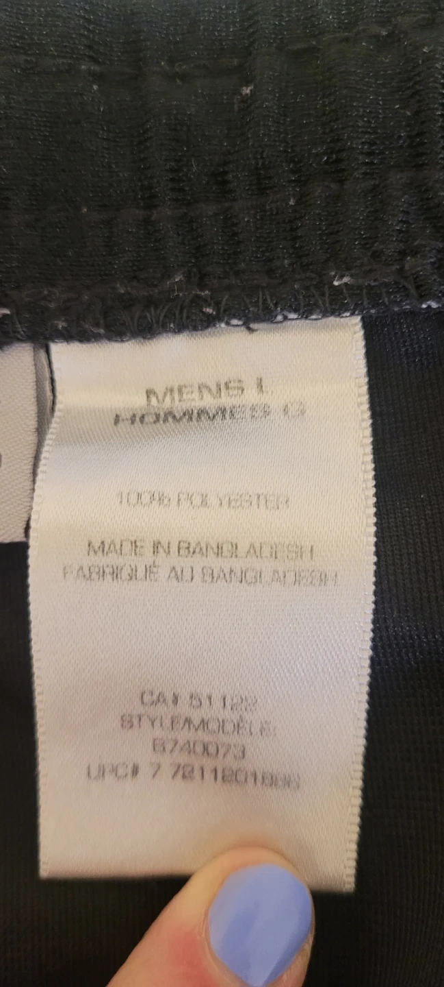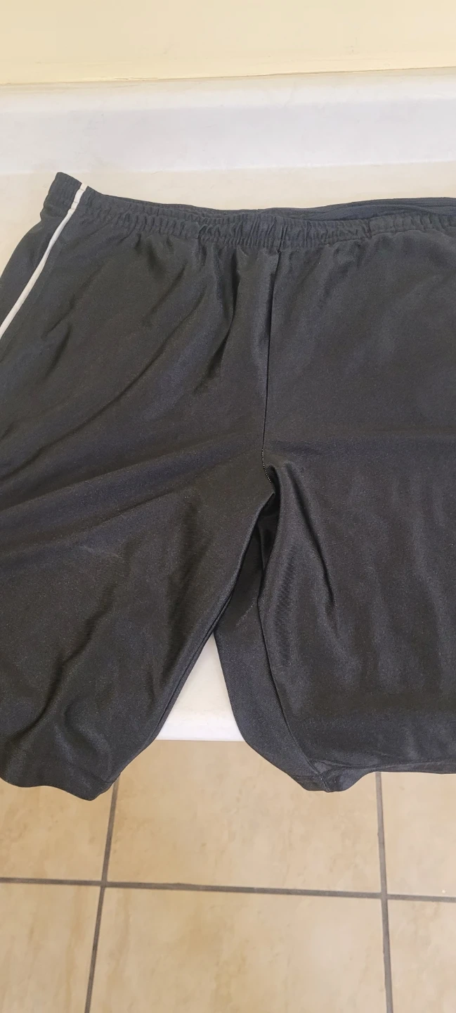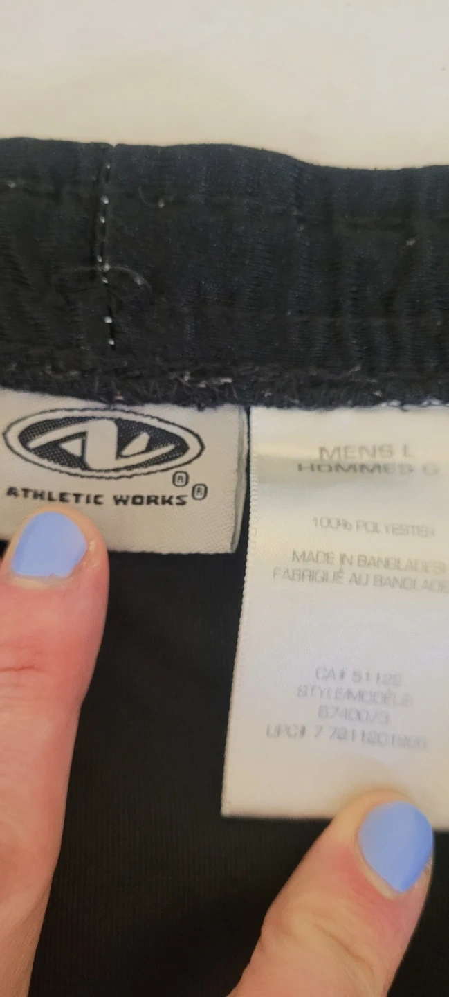 These black Athletic Works shorts are made of 100% polyester. They're a men's large size. Perfect for working out or casual wear!