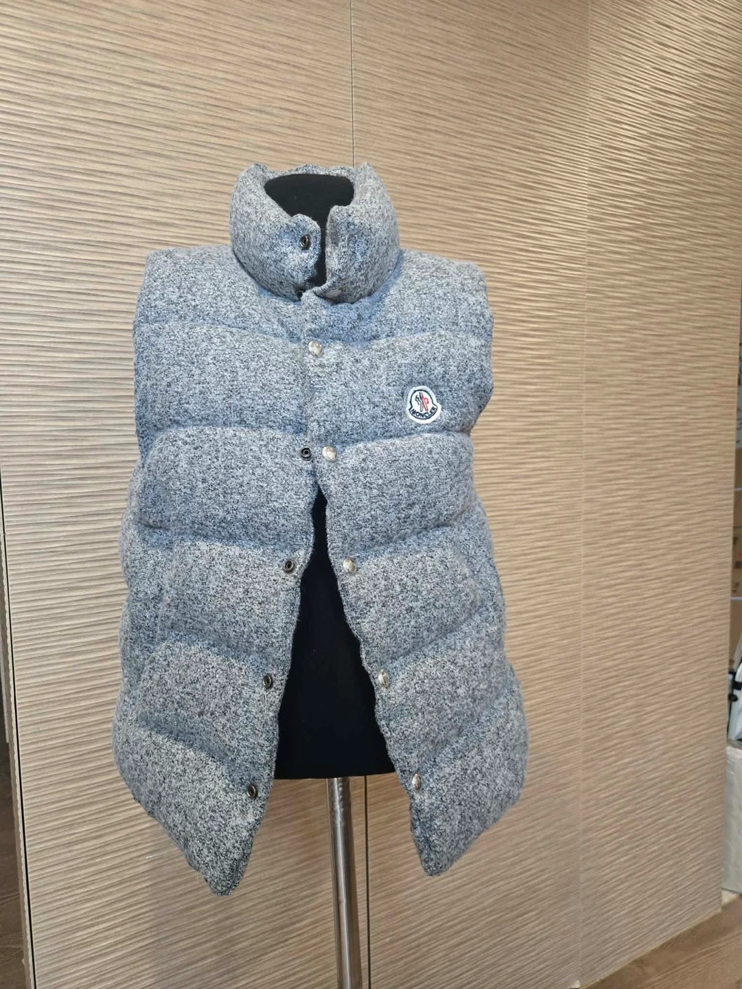 Authentic Moncler puffer vest. Features a stand-up collar and snap button closure. It's lightweight and perfect for layering.