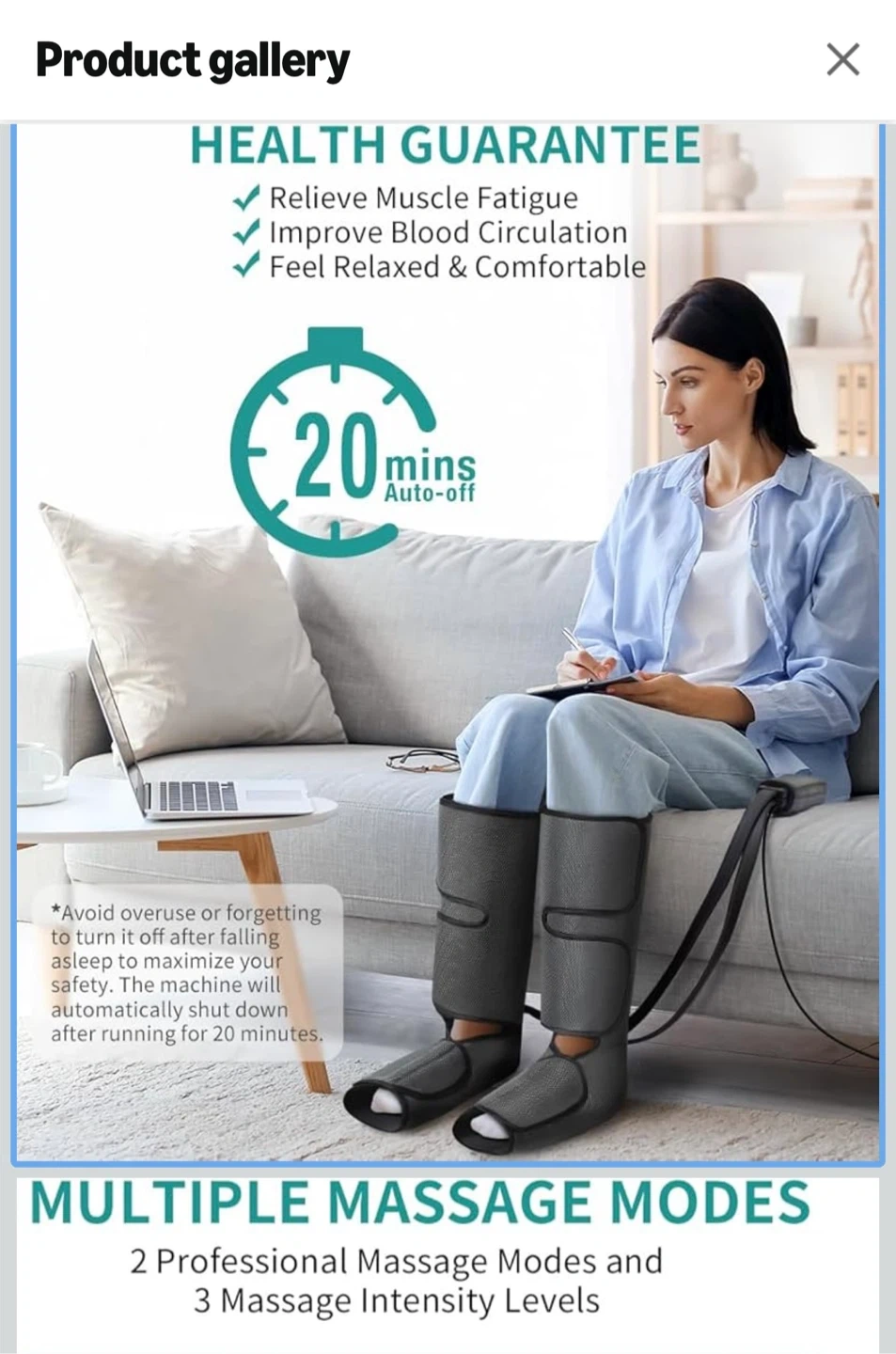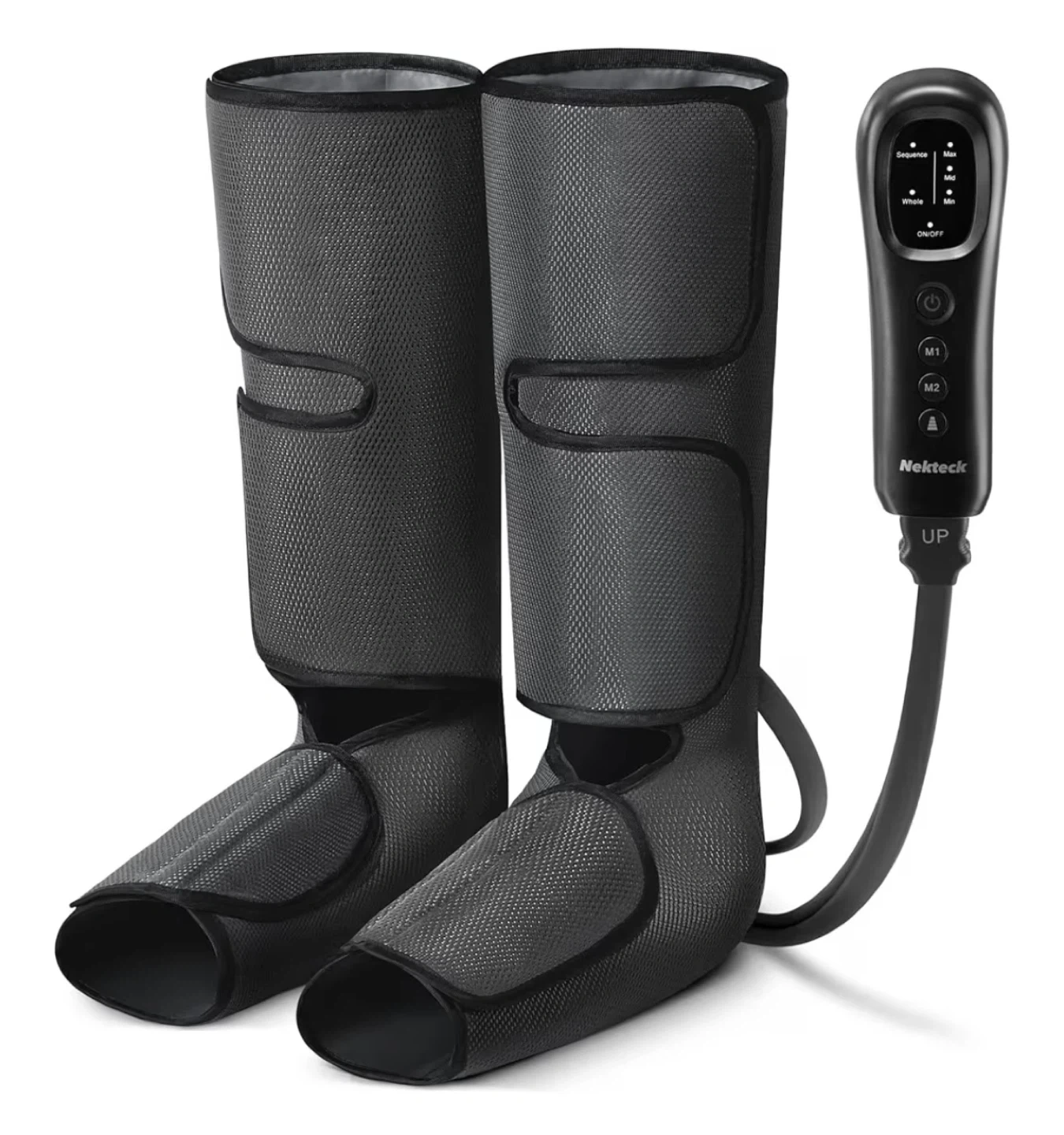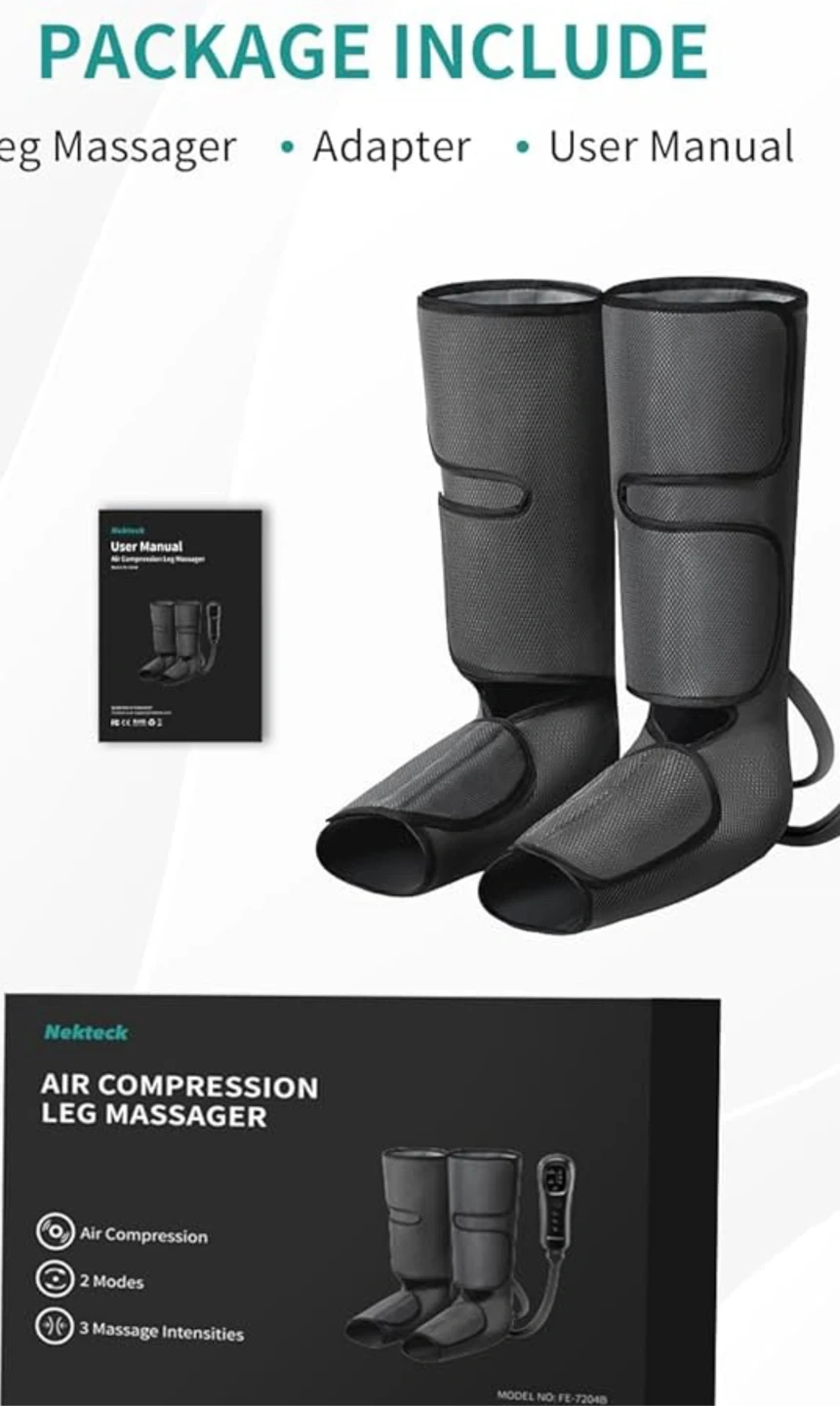 Nekteck air compression leg massager in dark gray. This set includes the leg massager wraps, an adapter, and a user manual. It features 2 massage modes and 3 intensity levels, with a 20-minute auto-off function. It's great for relieving muscle fatigue and improving circulation.