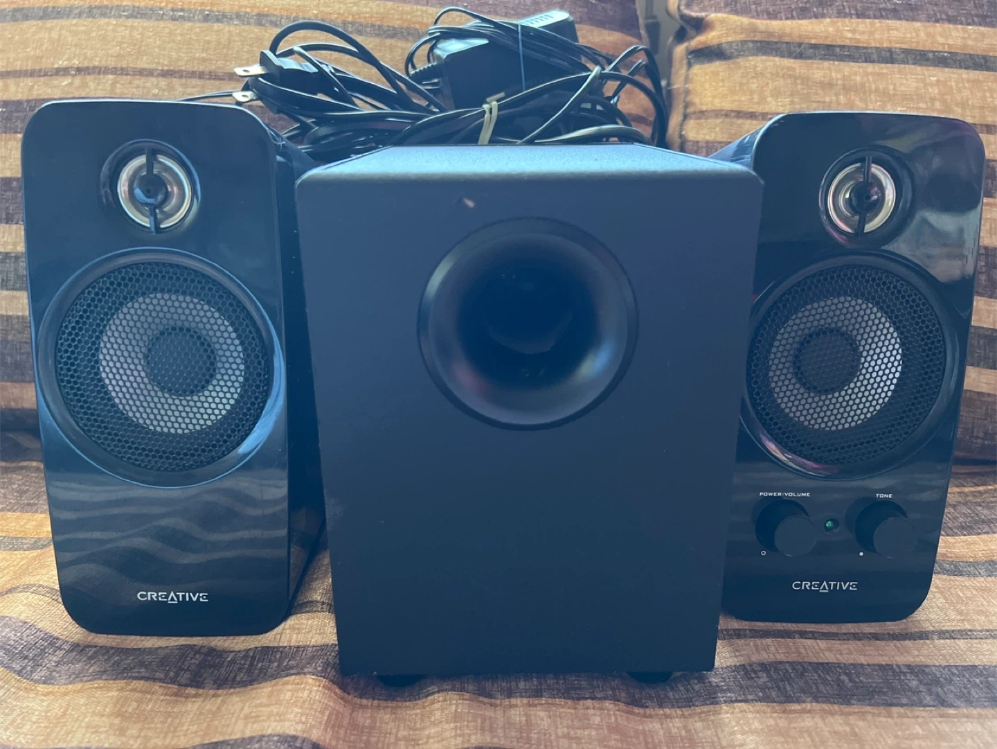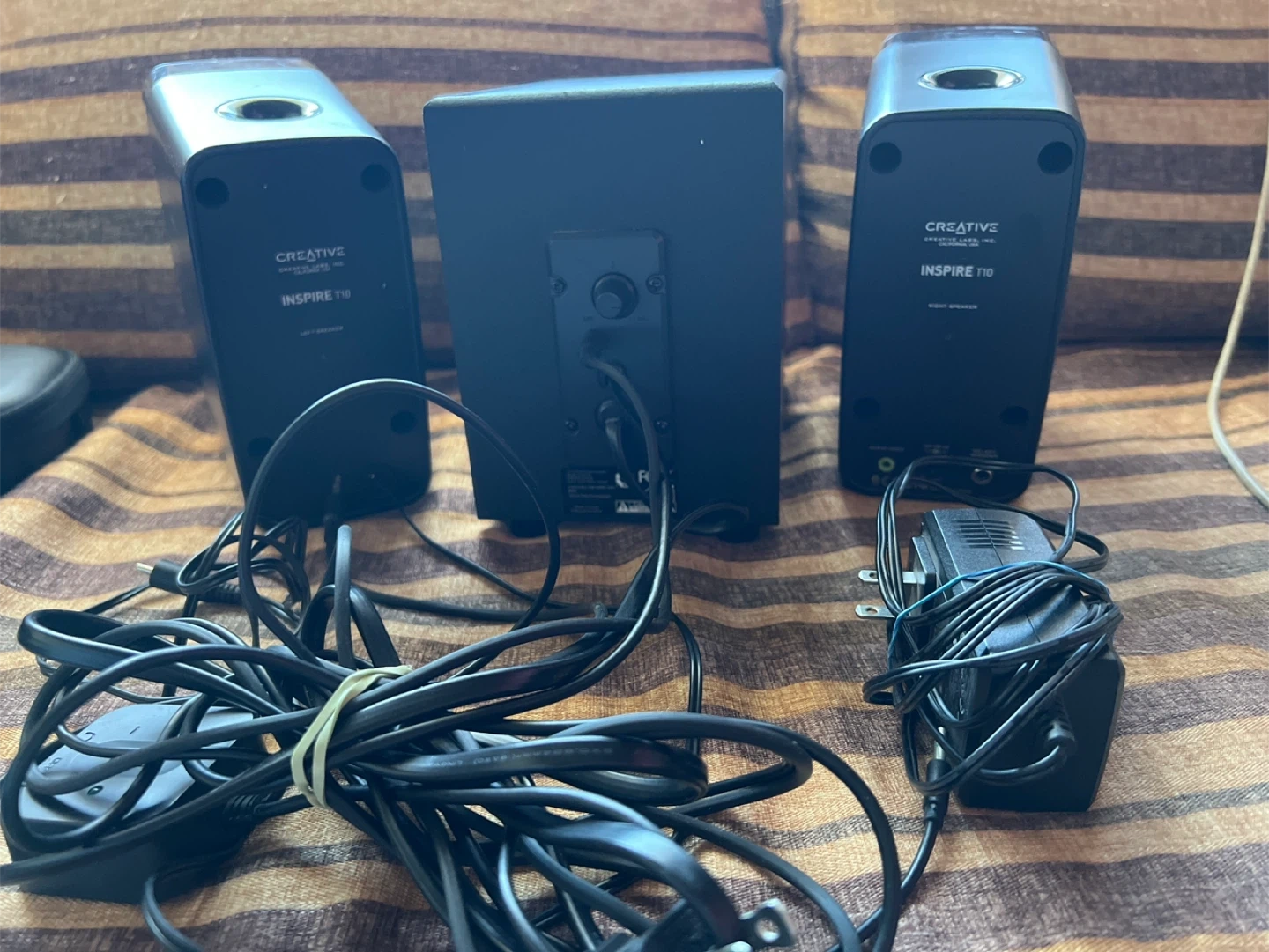 This is a set of Creative Inspire T10 2.0 desktop speakers with a subwoofer. They're black and include the necessary cables and power adapter. This speaker set is great for enhancing your computer's audio experience!