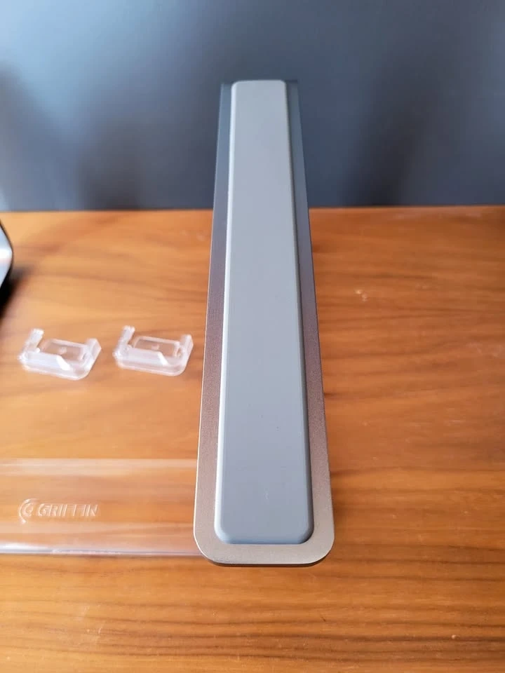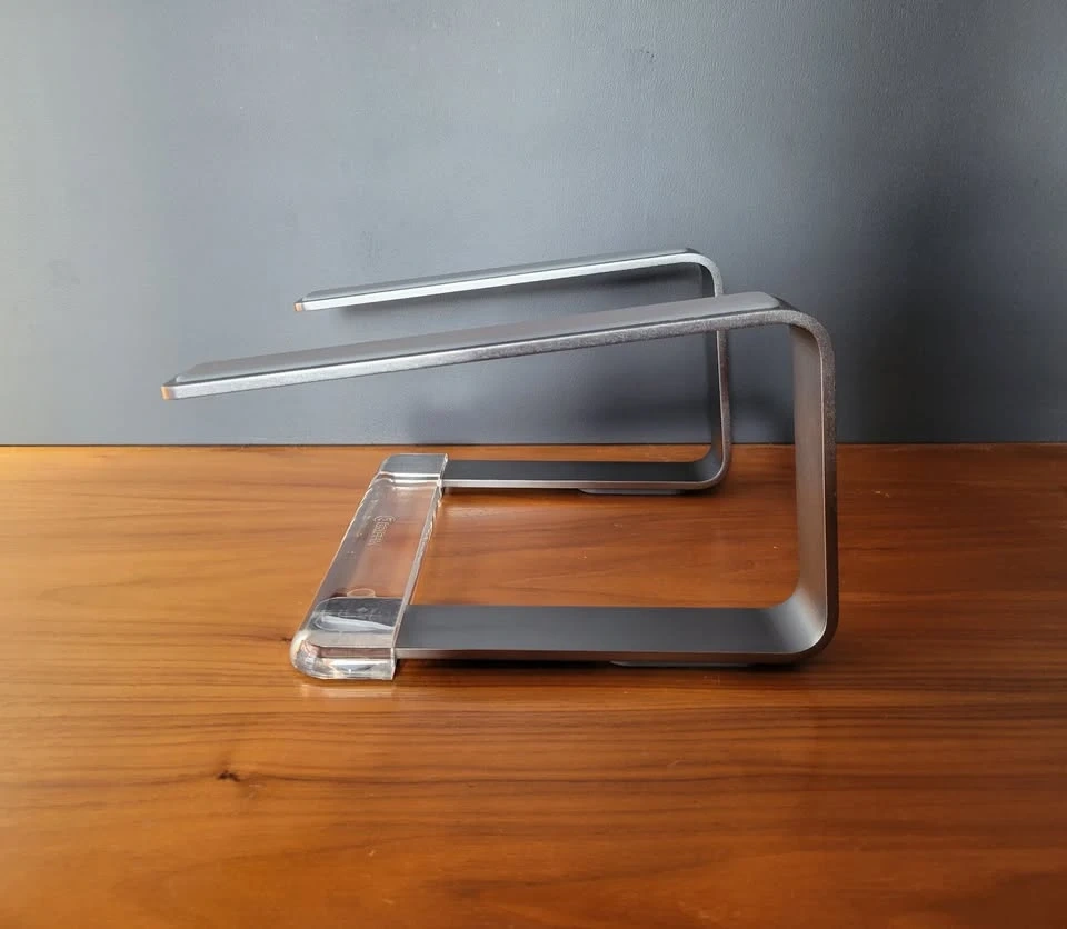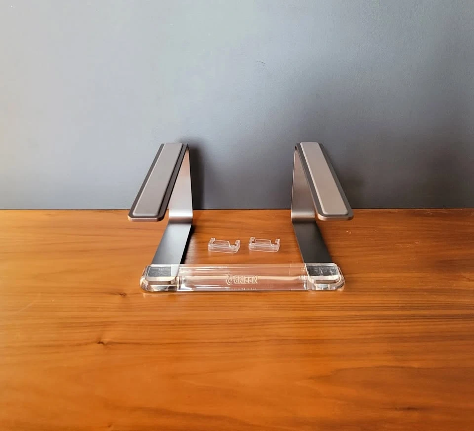 This is a sleek laptop stand from Griffin. It's made of brushed aluminum and clear acrylic. The stand elevates your laptop for better airflow and ergonomics.
