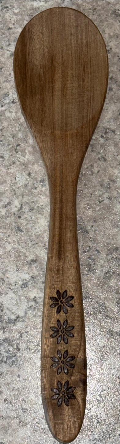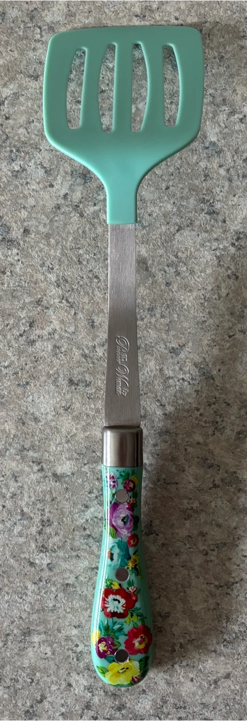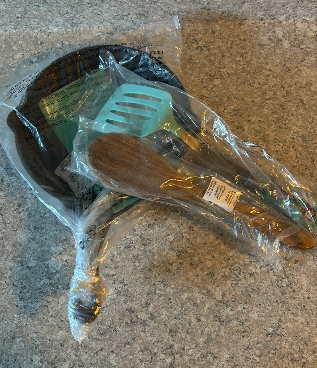 This set includes a pre-seasoned cast iron skillet and a collection of kitchen utensils. You'll get a blue spatula and a wooden spoon with a floral design. It's great for everyday cooking needs! Pick up only in Allendale.