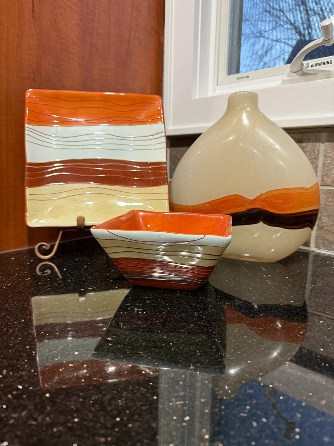 Selling a decorative set that includes a square plate, a small bowl, and a vase. The set features a unique striped pattern in shades of orange, brown, and cream. Perfect for adding a touch of style to your home decor!