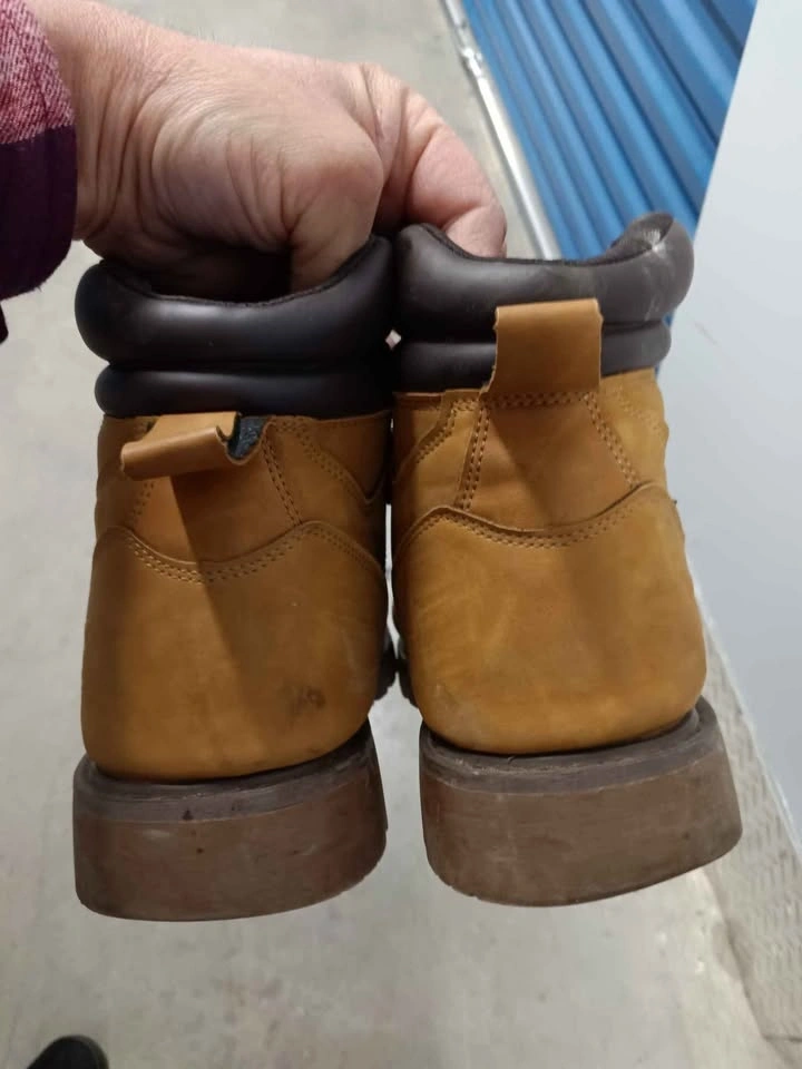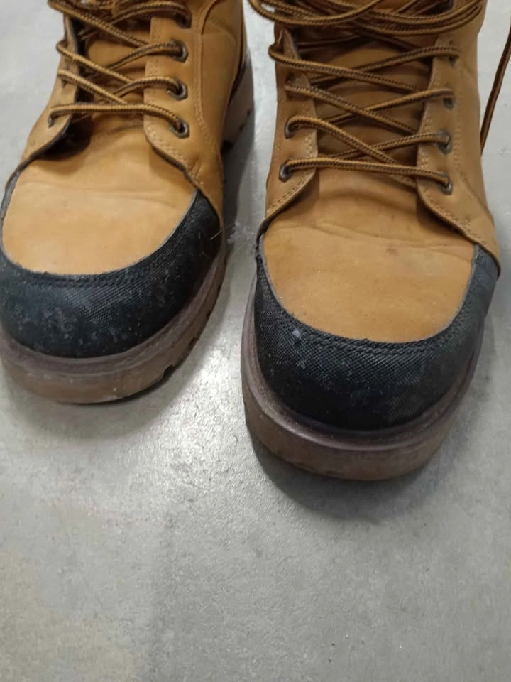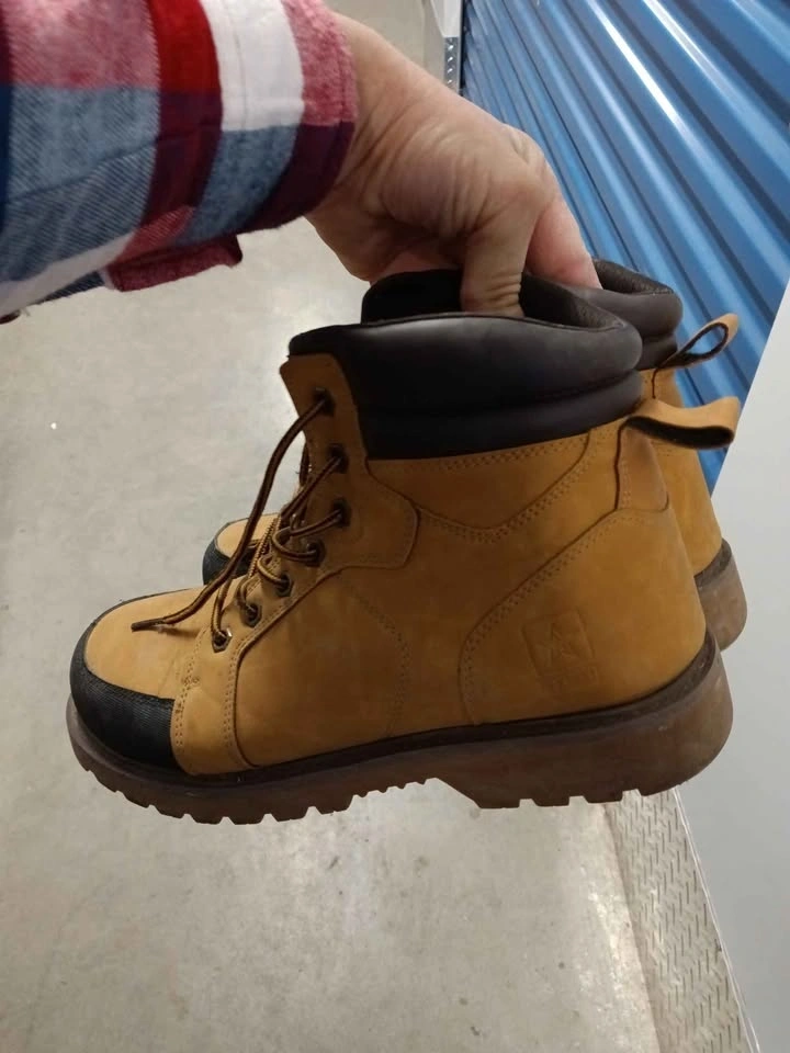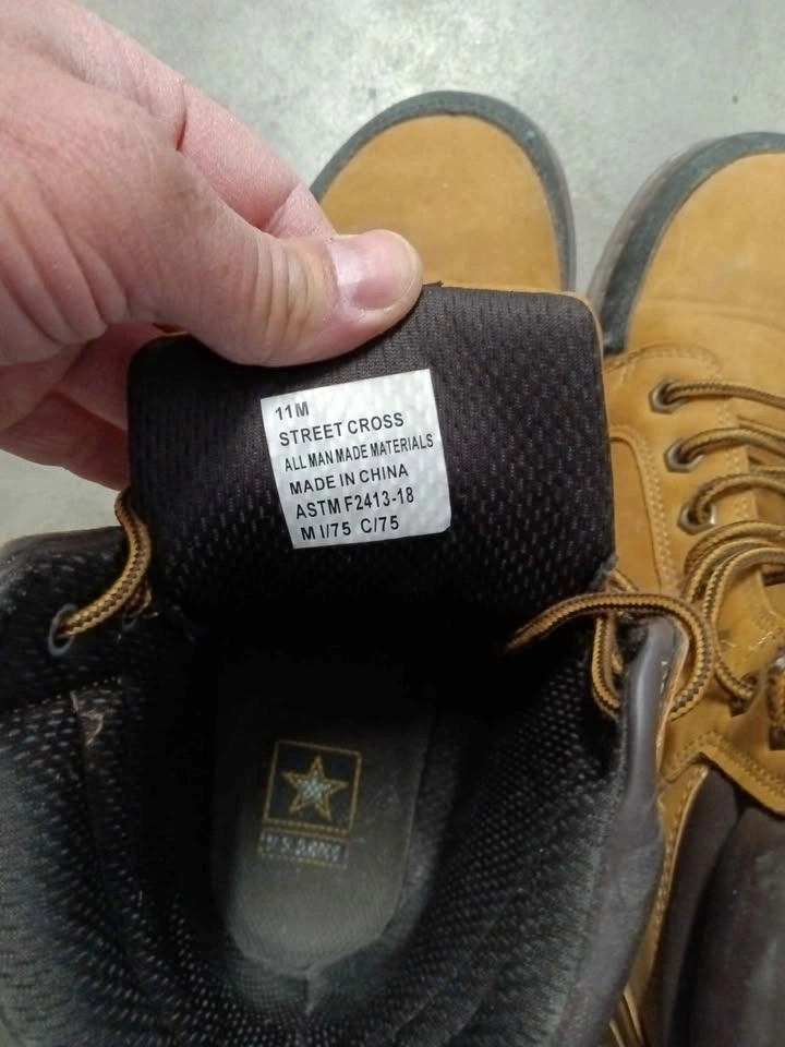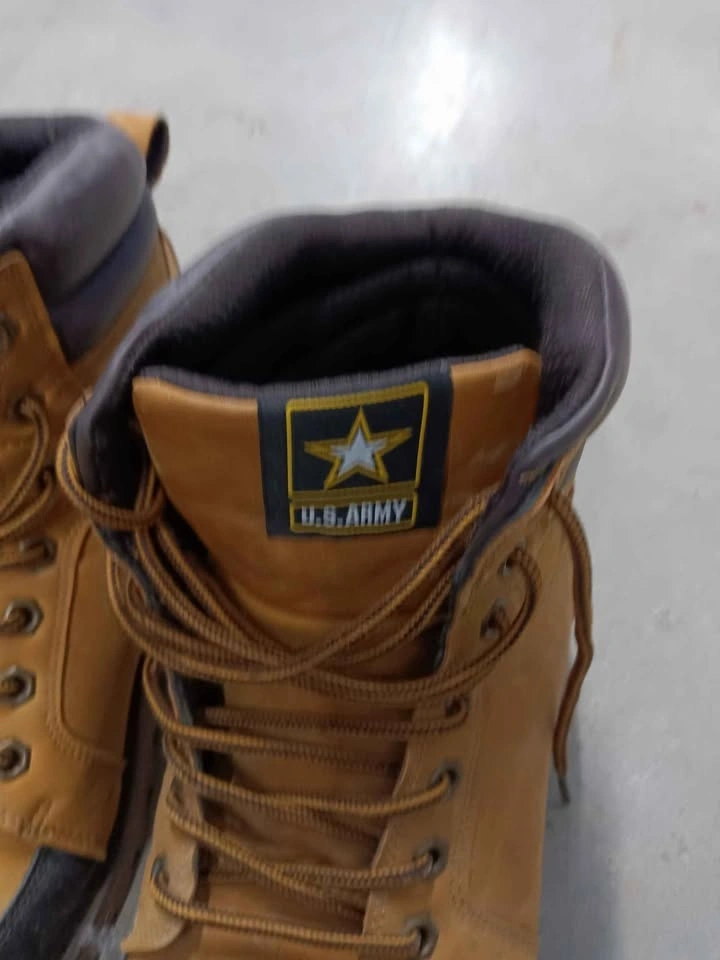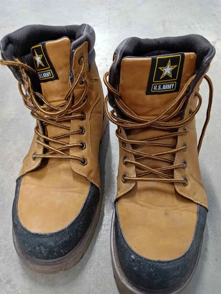 Durable tan nubuck work boots with U.S. Army branding on the tongue. These have black reinforced toe guards and dark brown padded collars for comfort. Laces are two-tone brown and yellow. Soles are thick rubber with visible tread wear.