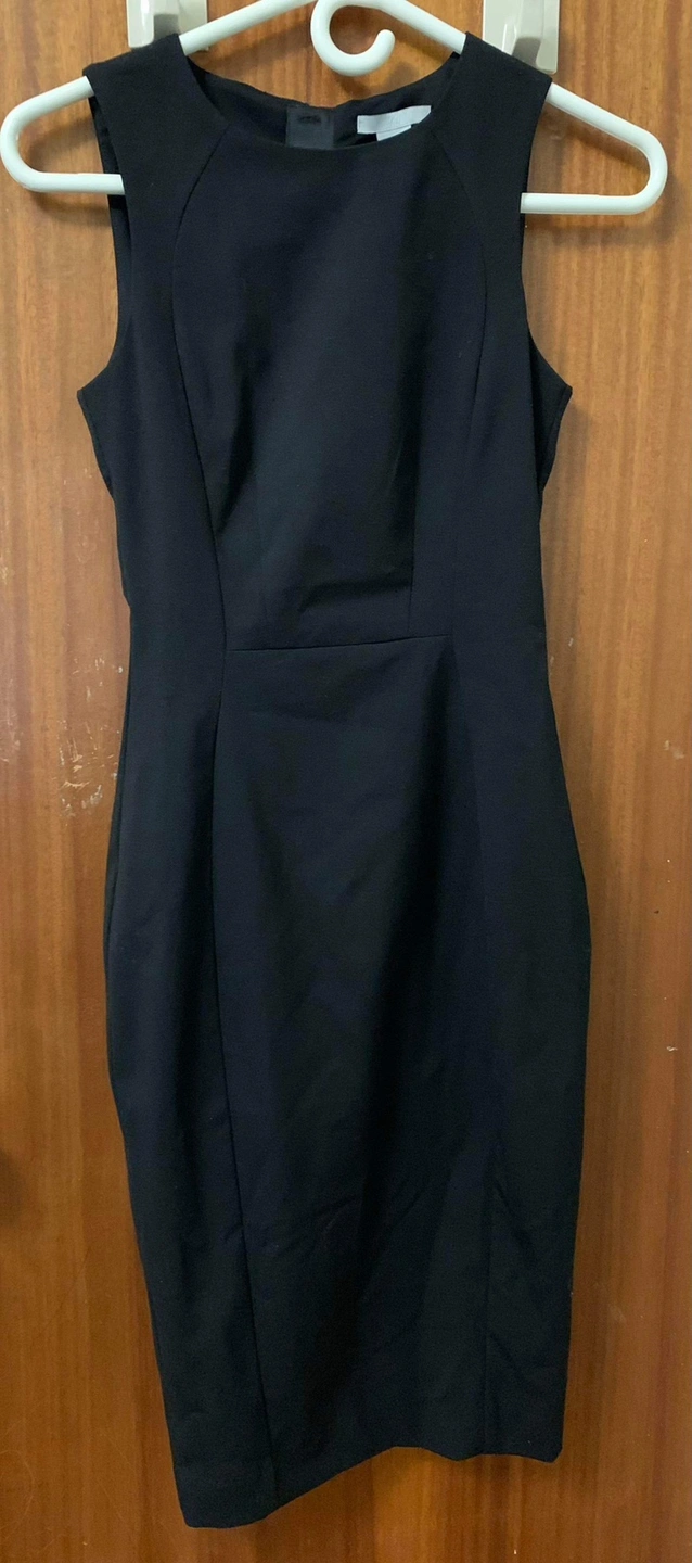 Sleeveless black dress with a round neckline. The dress is fitted and is a midi length. The fabric is a stretch material. It has a back zip.