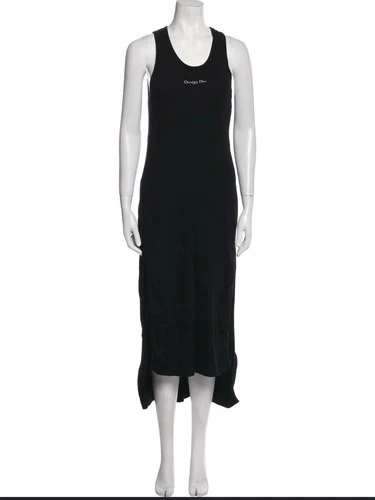 Authentic Christian Dior Paris sleeveless black ribbed dress, size M. Dress is new / unworn — brand label is present, original hang tag is missing. Elegant mid-length dress combining a sporty silhouette with couture style. Crafted from high-quality ribbed cotton jersey with Christian Dior Paris embroidery on the front. Features a straight cut, side slits, and a longer back hem for a modern, flattering look.