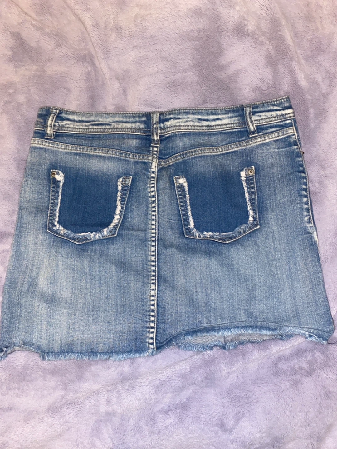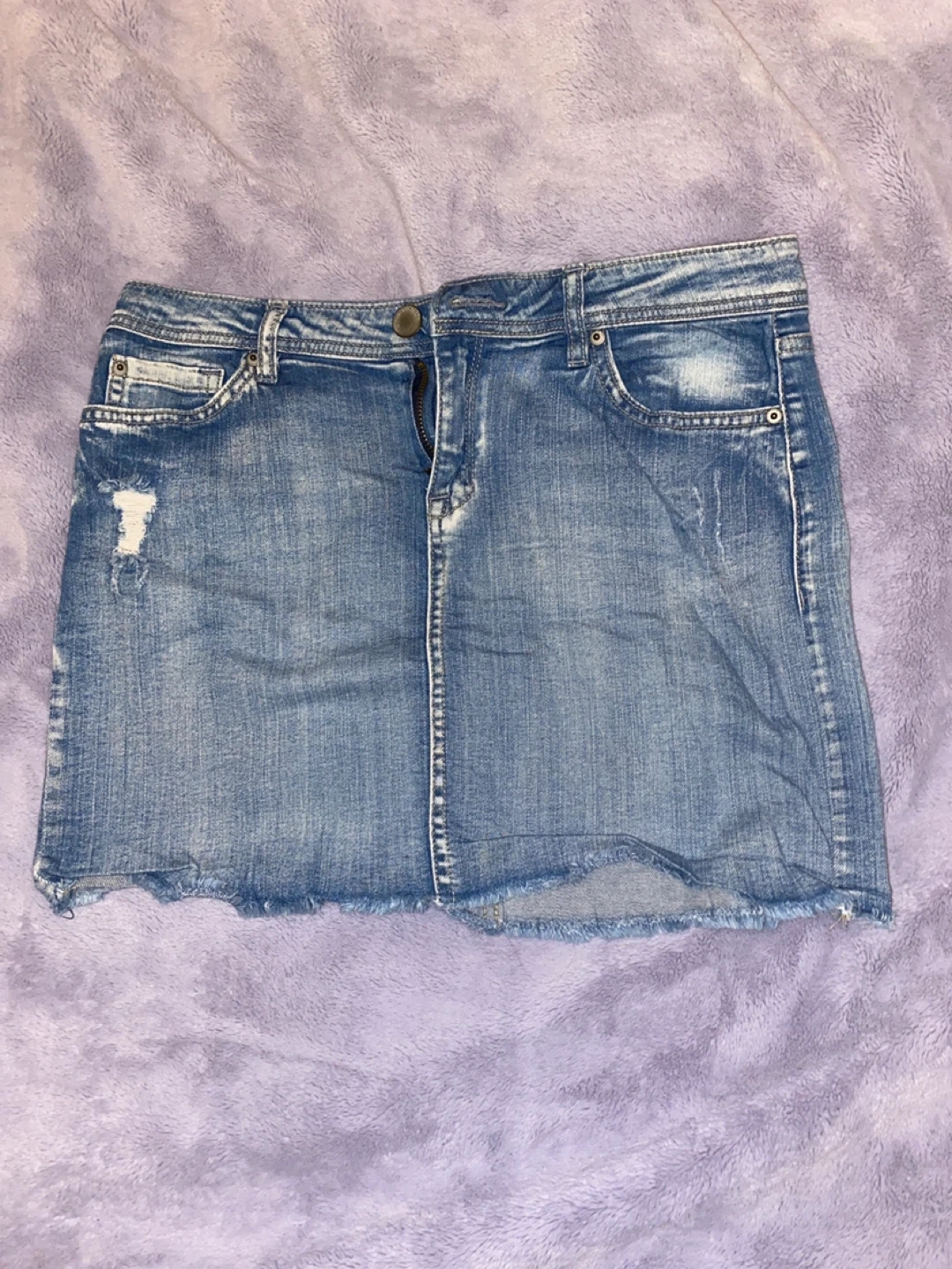A classic blue denim mini skirt from Life in Progress. It has a frayed hem and distressed details. Made with a cotton blend for comfort.