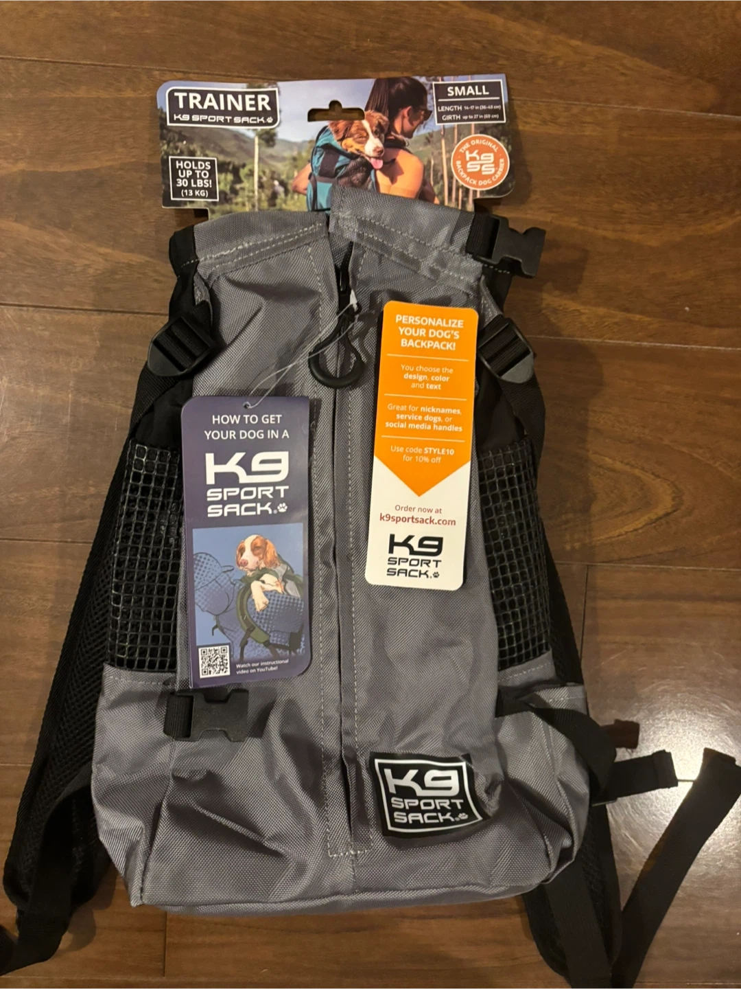 This is a K9 Sport Sack Trainer backpack for dogs. It's a small size and holds up to 30 lbs. The backpack is grey with black accents. It features adjustable straps and mesh panels.