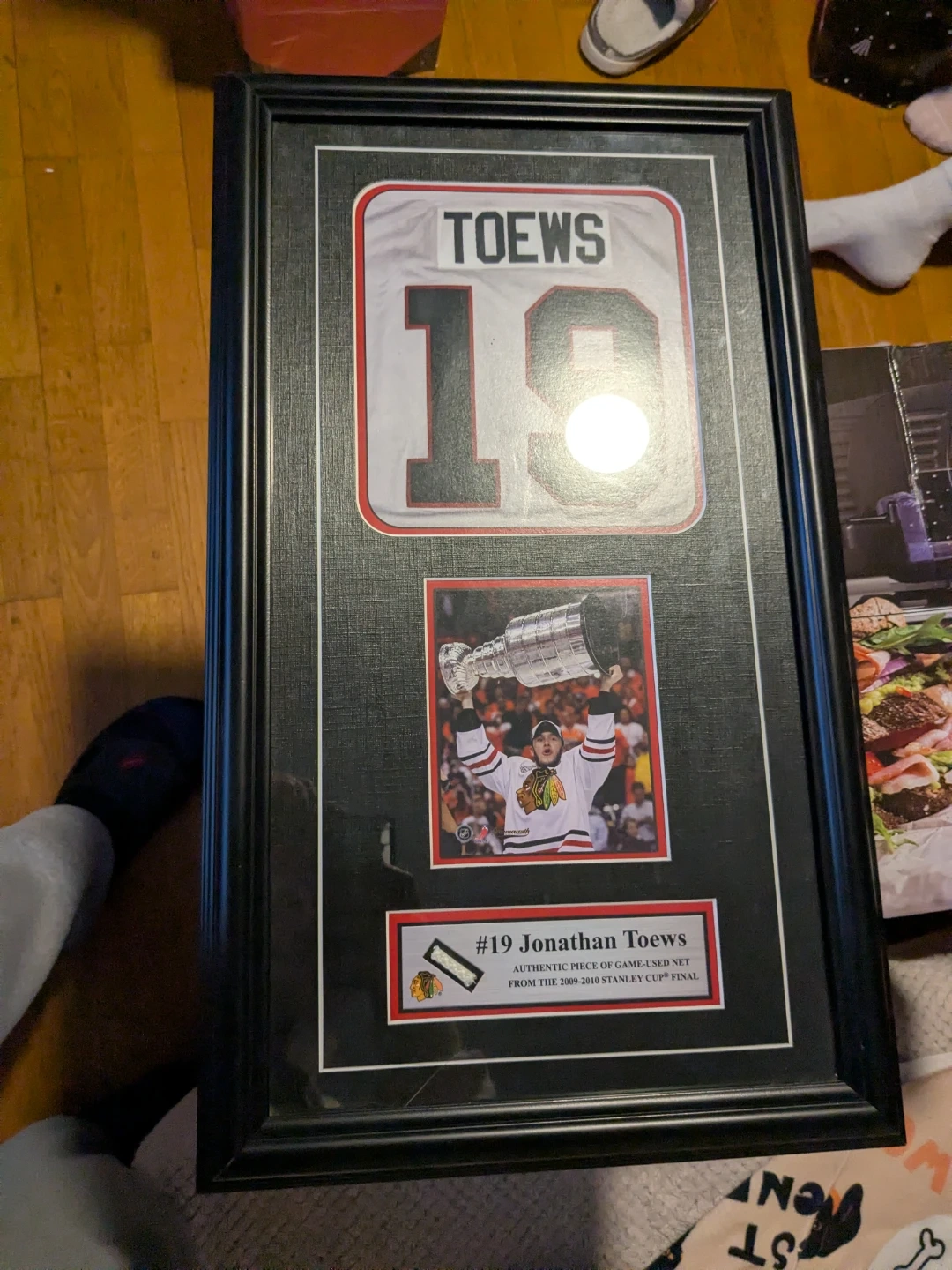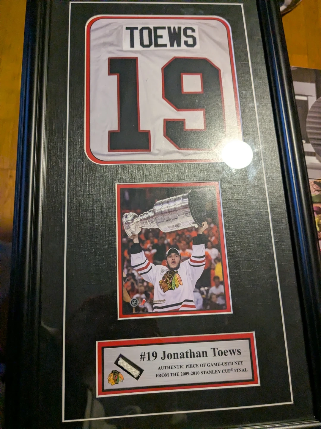 The display includes a replica jersey with Toews' name and number (19), a photo of him holding the Stanley Cup, and a small swatch of the actual game-used net.