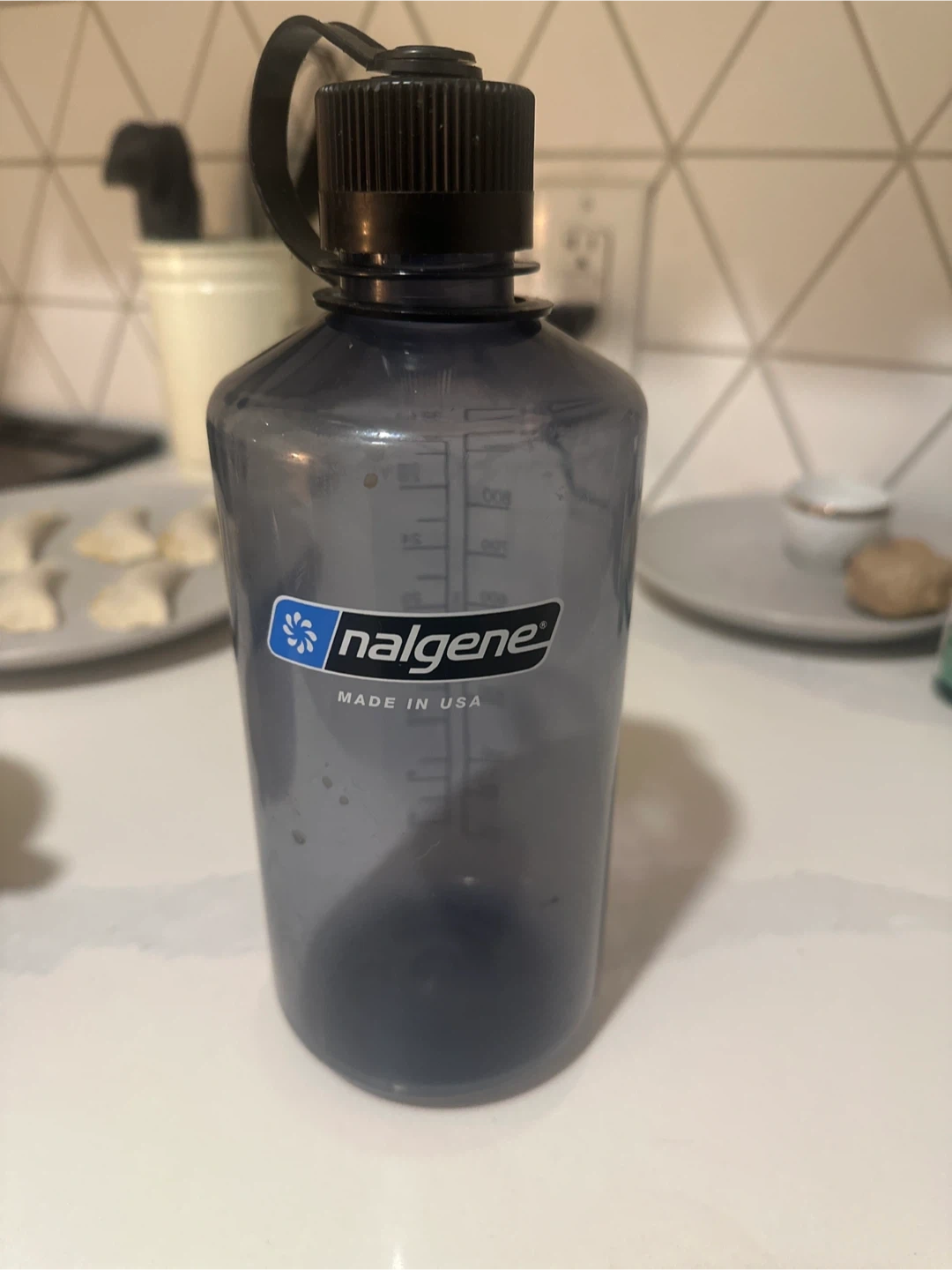 This is a Nalgene water bottle. It's made of durable plastic and has volume markings on the side. The cap is attached with a loop for easy carrying.