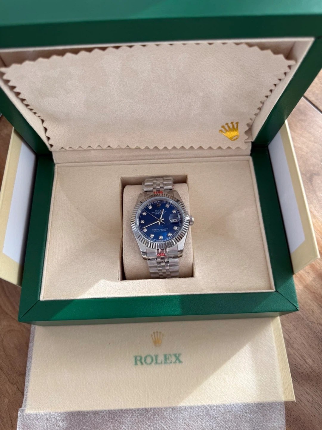 This is a Rolex Oyster Perpetual Datejust watch. It features a blue dial with diamond hour markers and a fluted bezel. It comes with its original box and packaging.