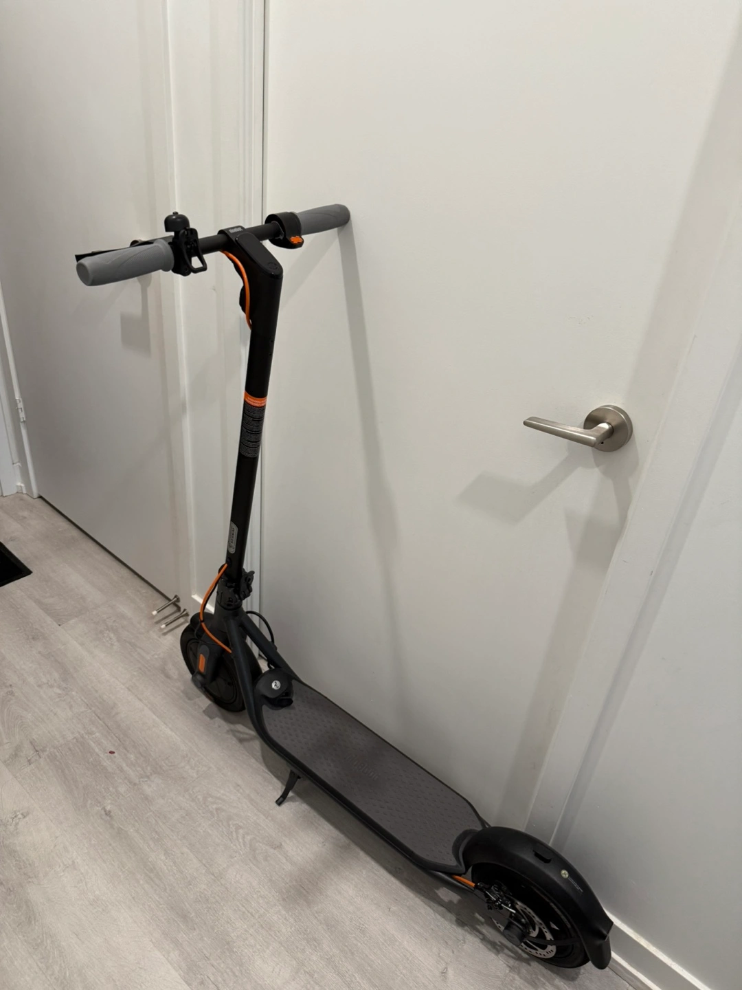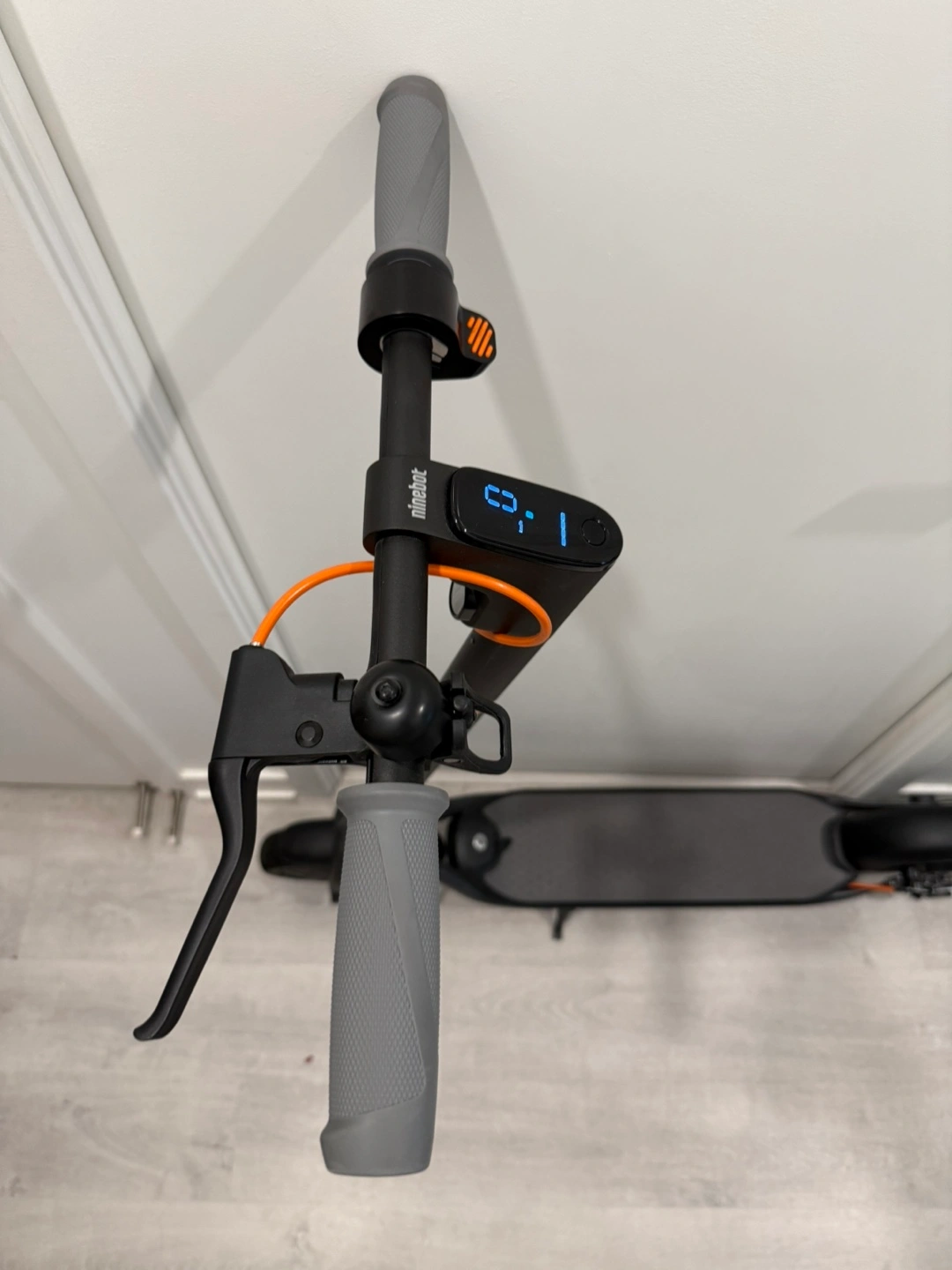 Ninebot by Segway electric kick scooter. Great for commuting. Features include a digital display, hand brakes, and a bell. Durable construction. Easy to fold and store.