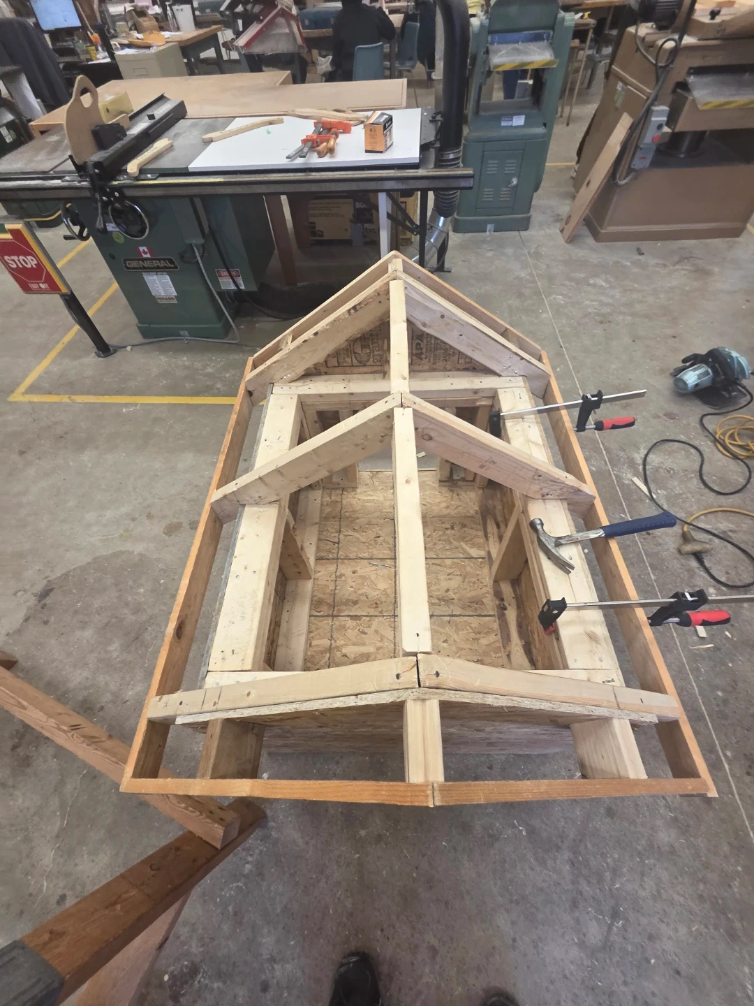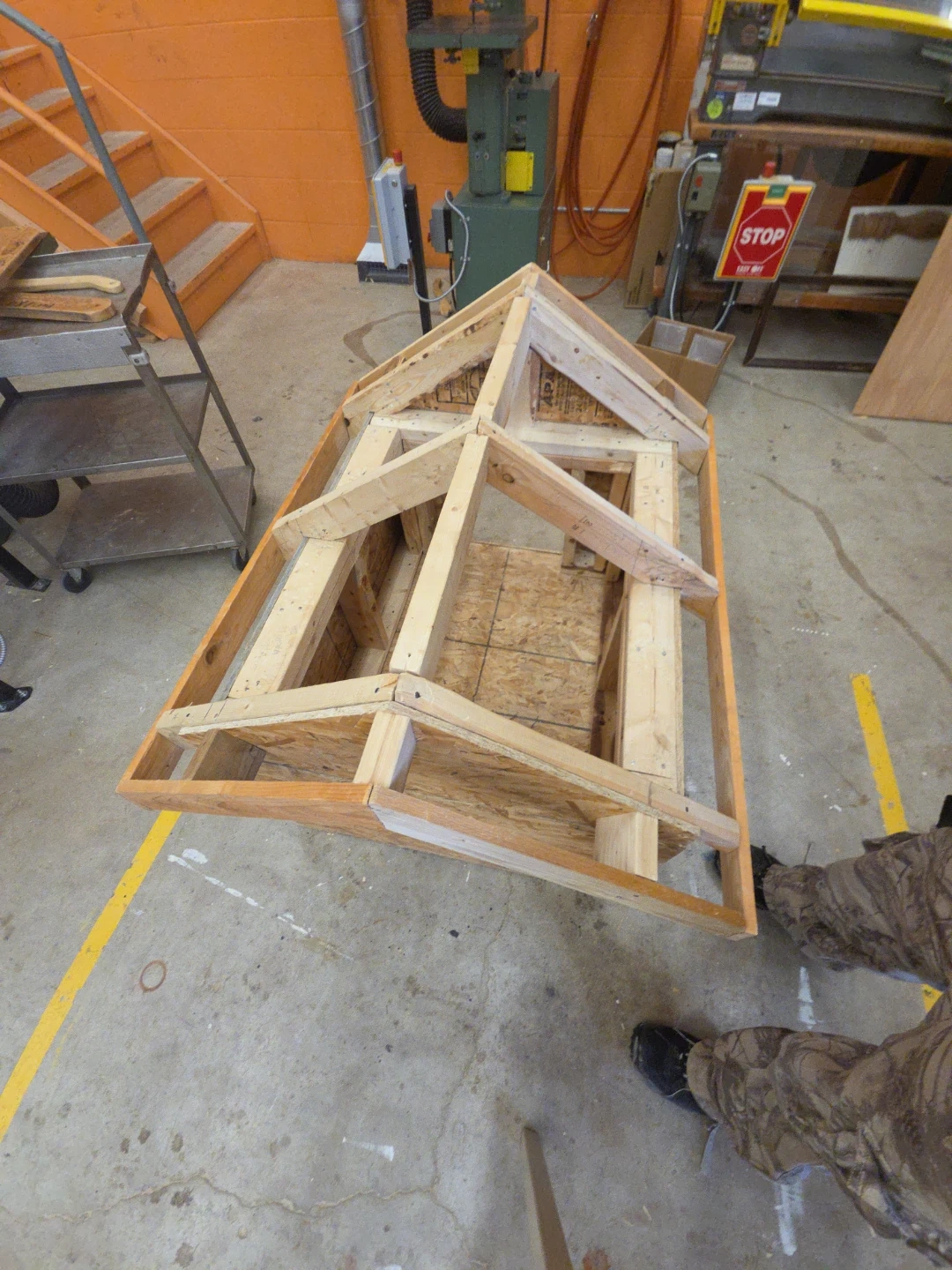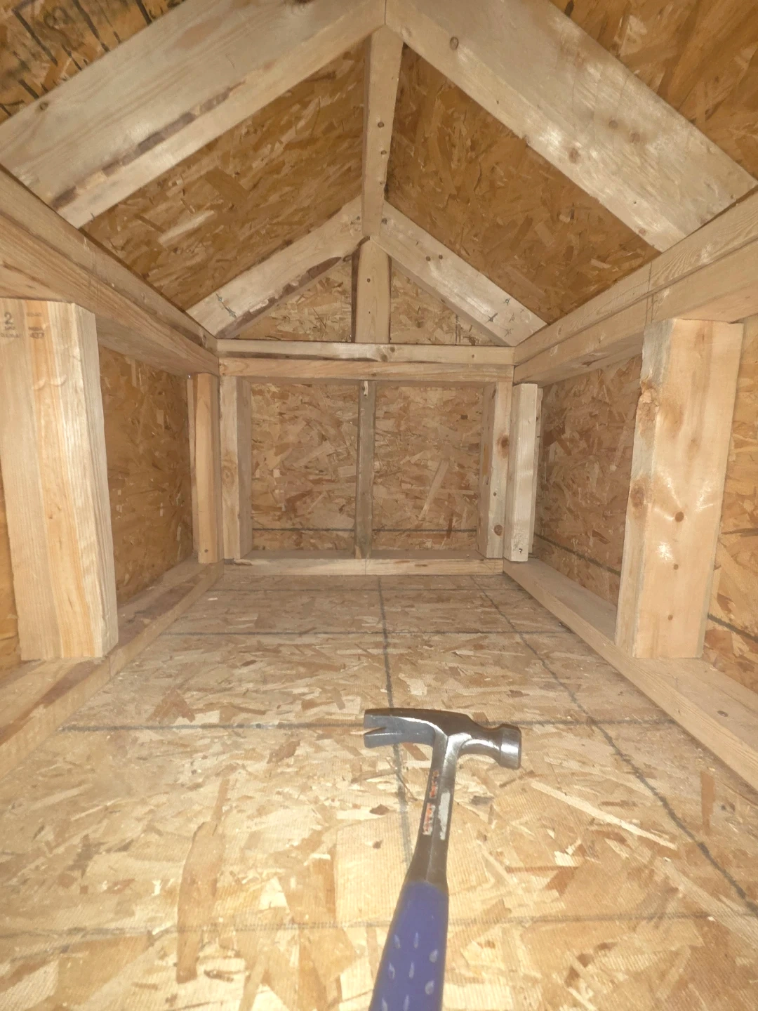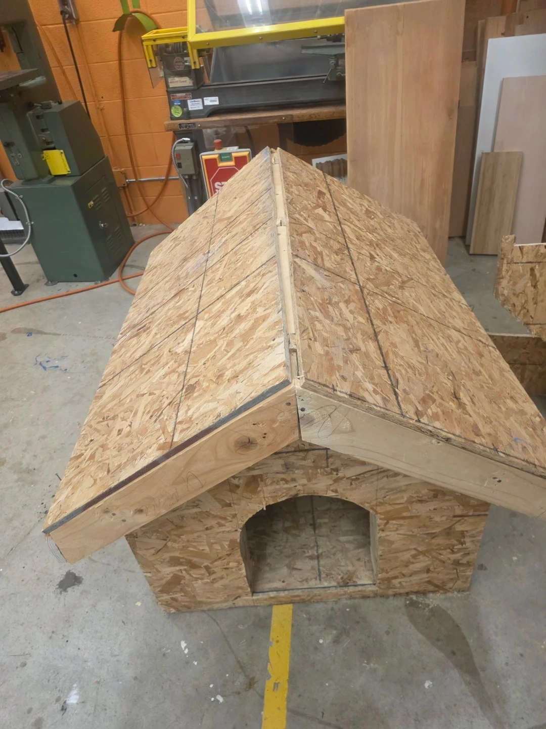 Solidly constructed wooden dog house, ready and Features a sturdy frame and a weather-resistant shingled roof for protection. Interior is spacious and well-supported. A great project and a cozy home for their furry friend. This shelter is built to last!