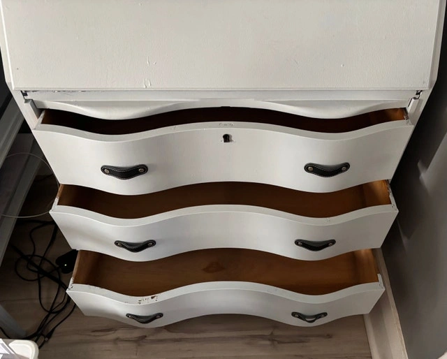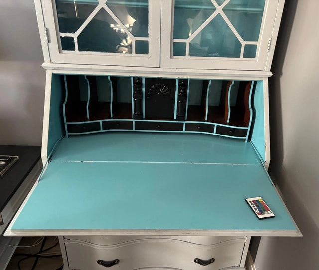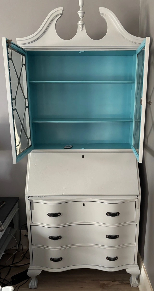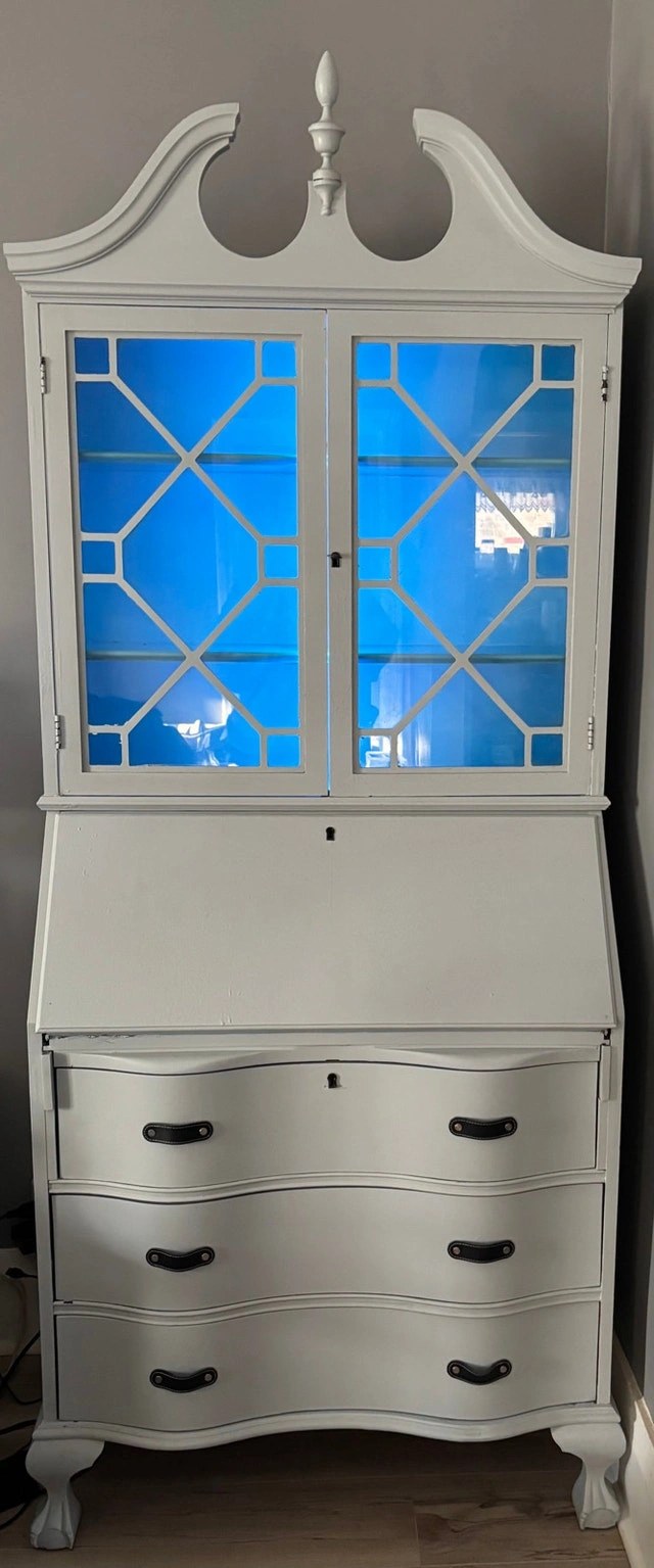 Light grey secretary desk with teal LED light inside the shelf area. Features leather pulls (originals included), key locks, glass doors, a drop-front, and a top drawer. Dimensions: 16 3/4” deep, 33” wide, 79” high.