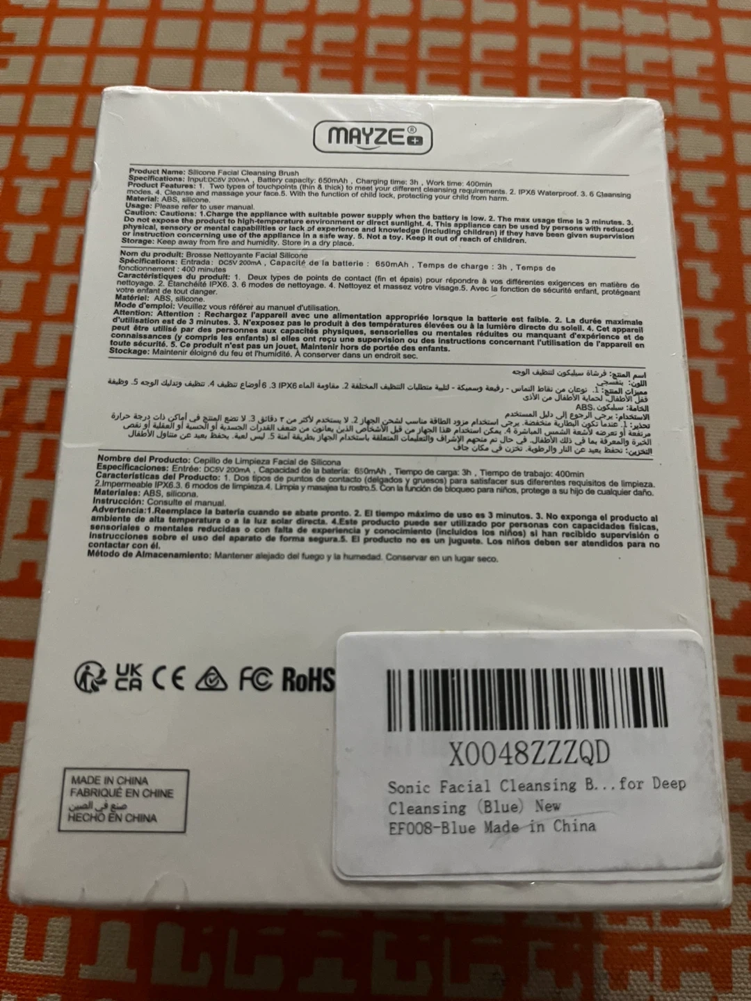 This MAYZE silicone facial cleansing brush is blue and cleanses and massages your face. It features 6 cleansing modes and two types of touchpoints: thin and thick. It's IPX6 waterproof.