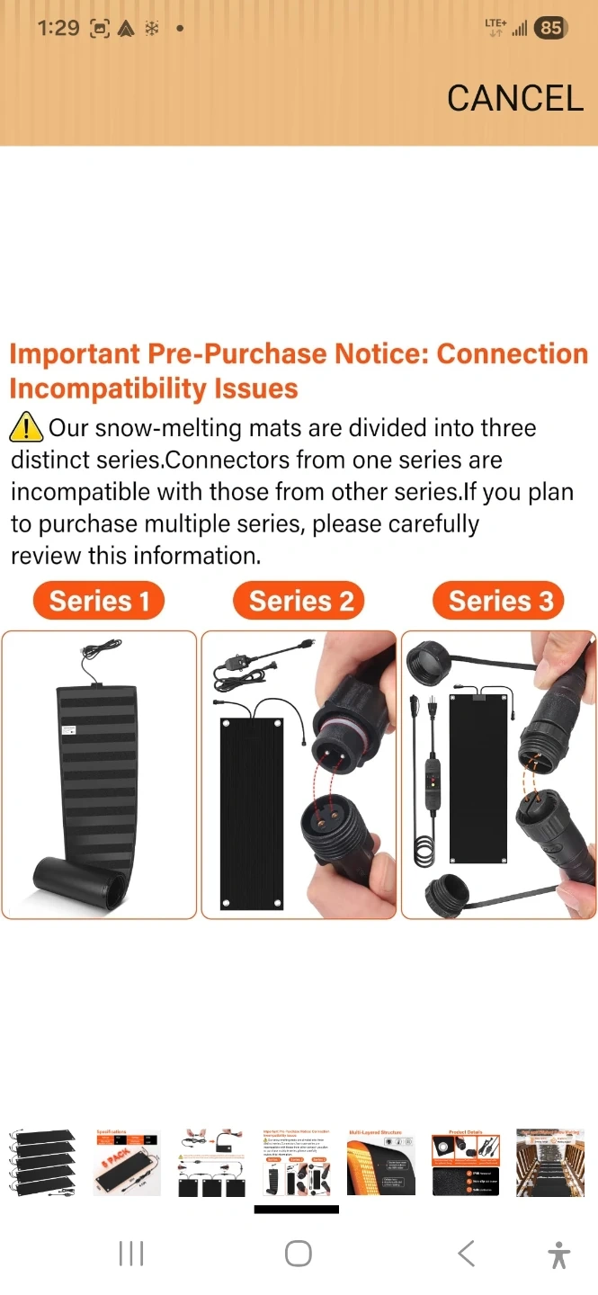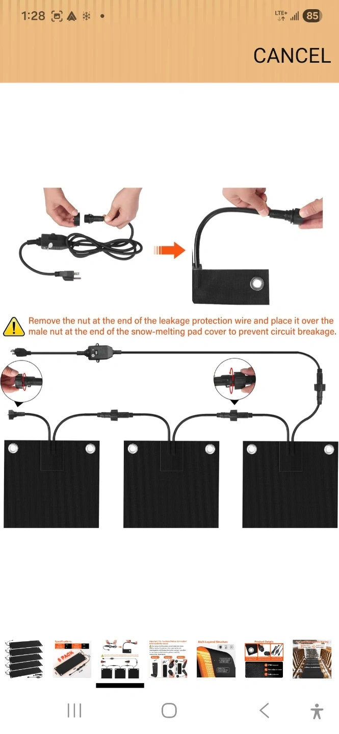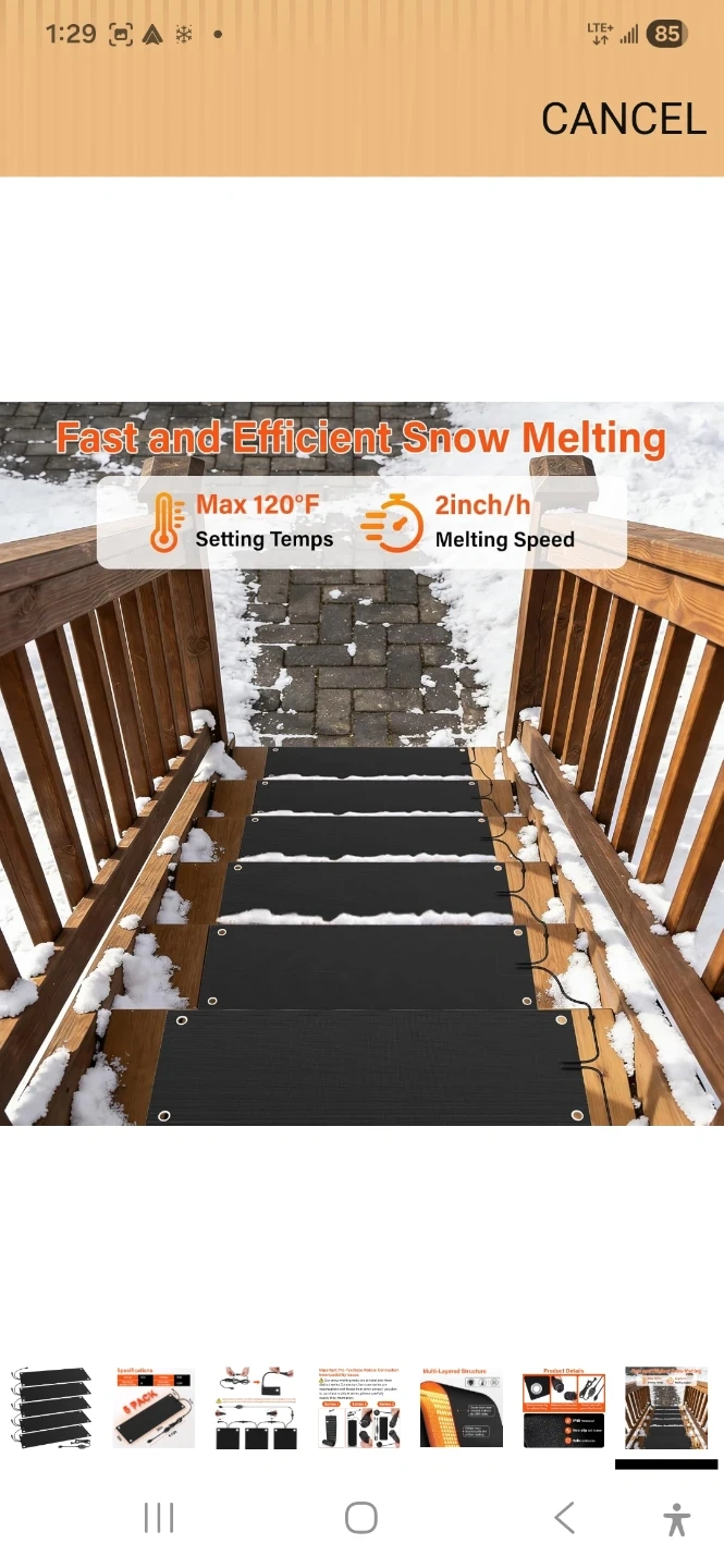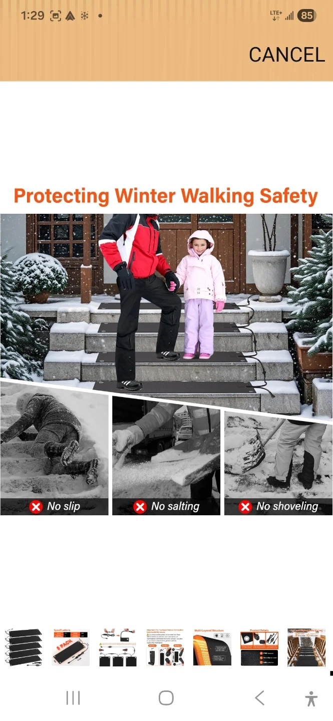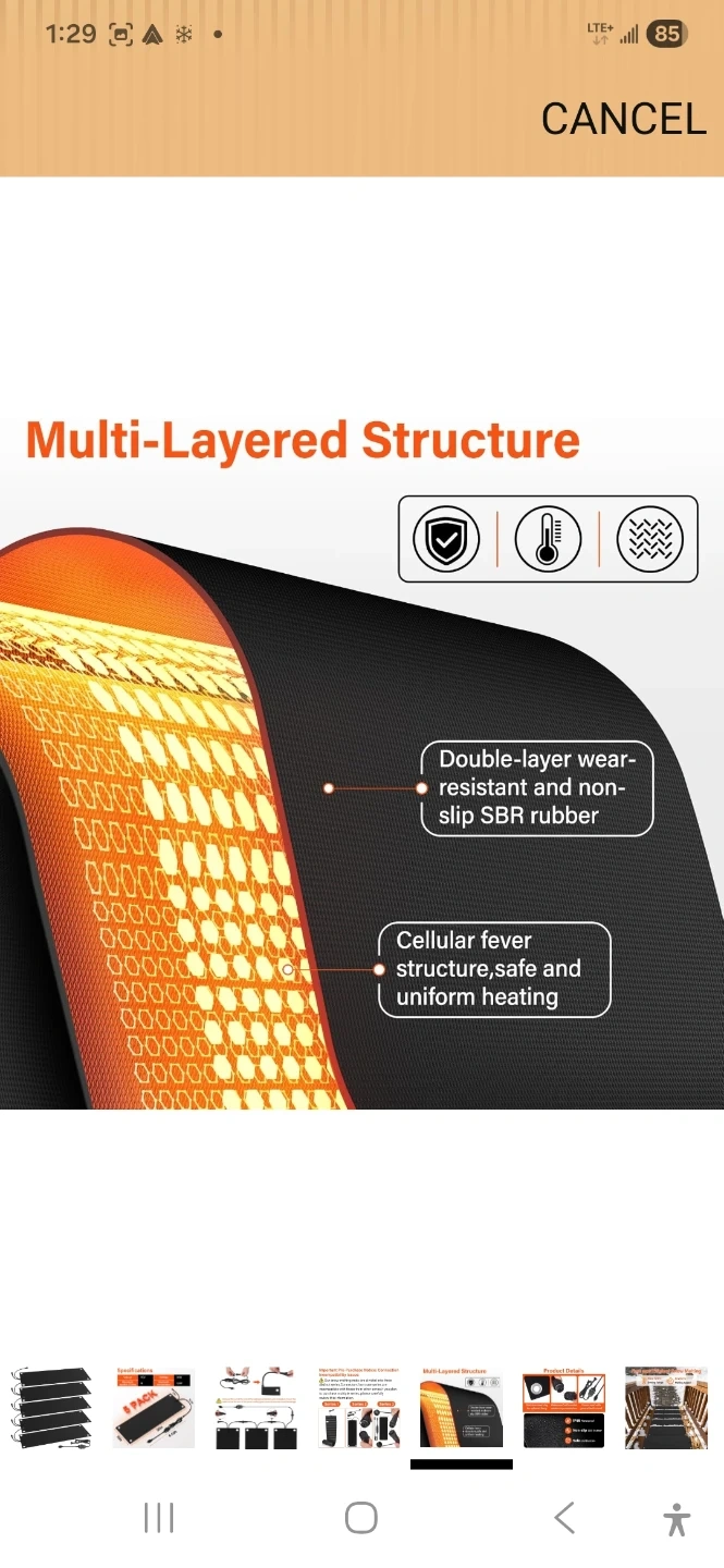 This is a 5-pack of heated snow melting mats. Each mat measures 30 inches by 10 inches. They feature a multi-layered structure with a double-layer wear-resistant and non-slip SBR rubber. The mats have a cellular fever structure for safe and uniform heating. They operate at 110V and consume 90W, with a maximum temperature of 120°F. These mats are designed to prevent ice and snow buildup.