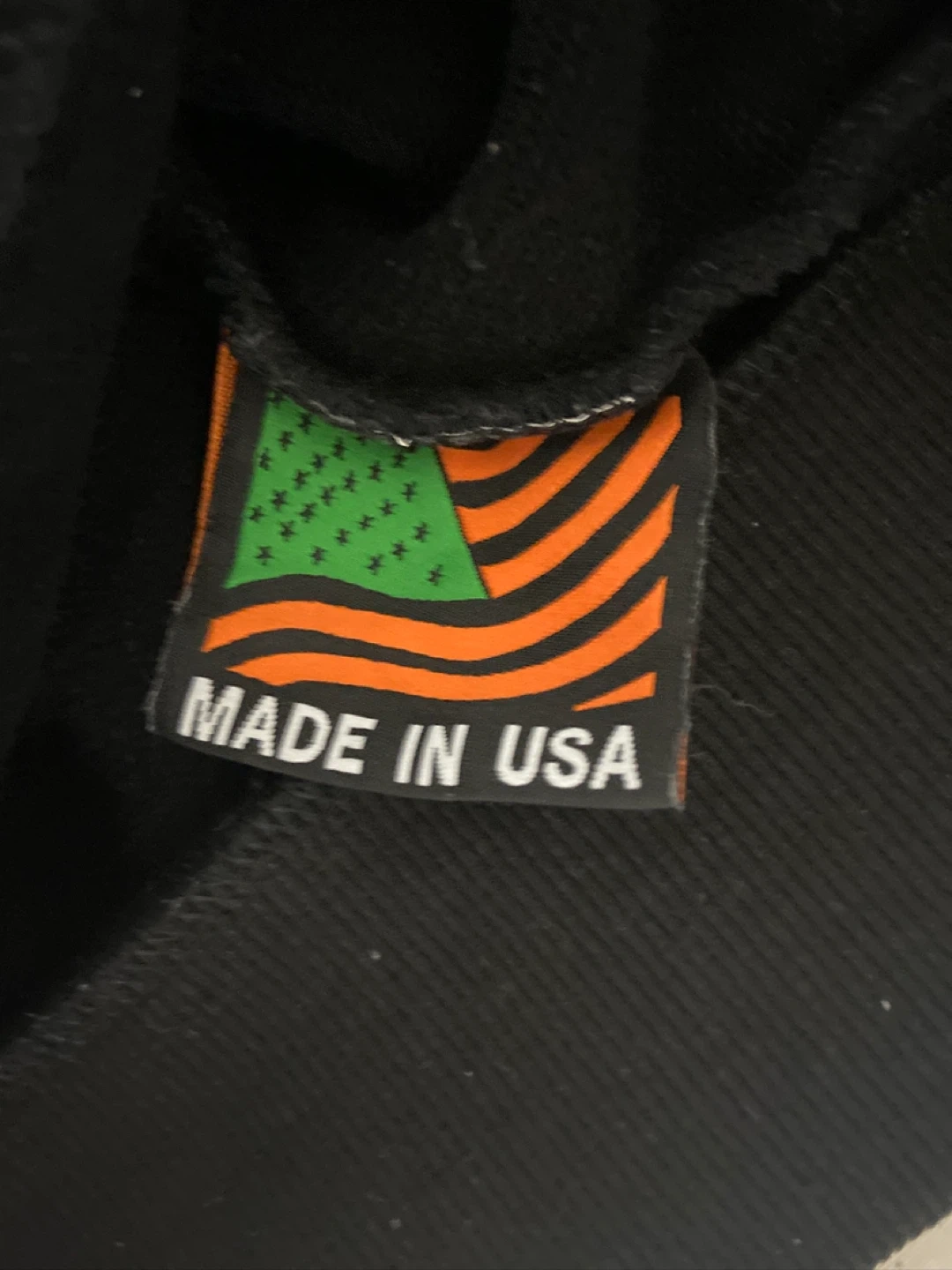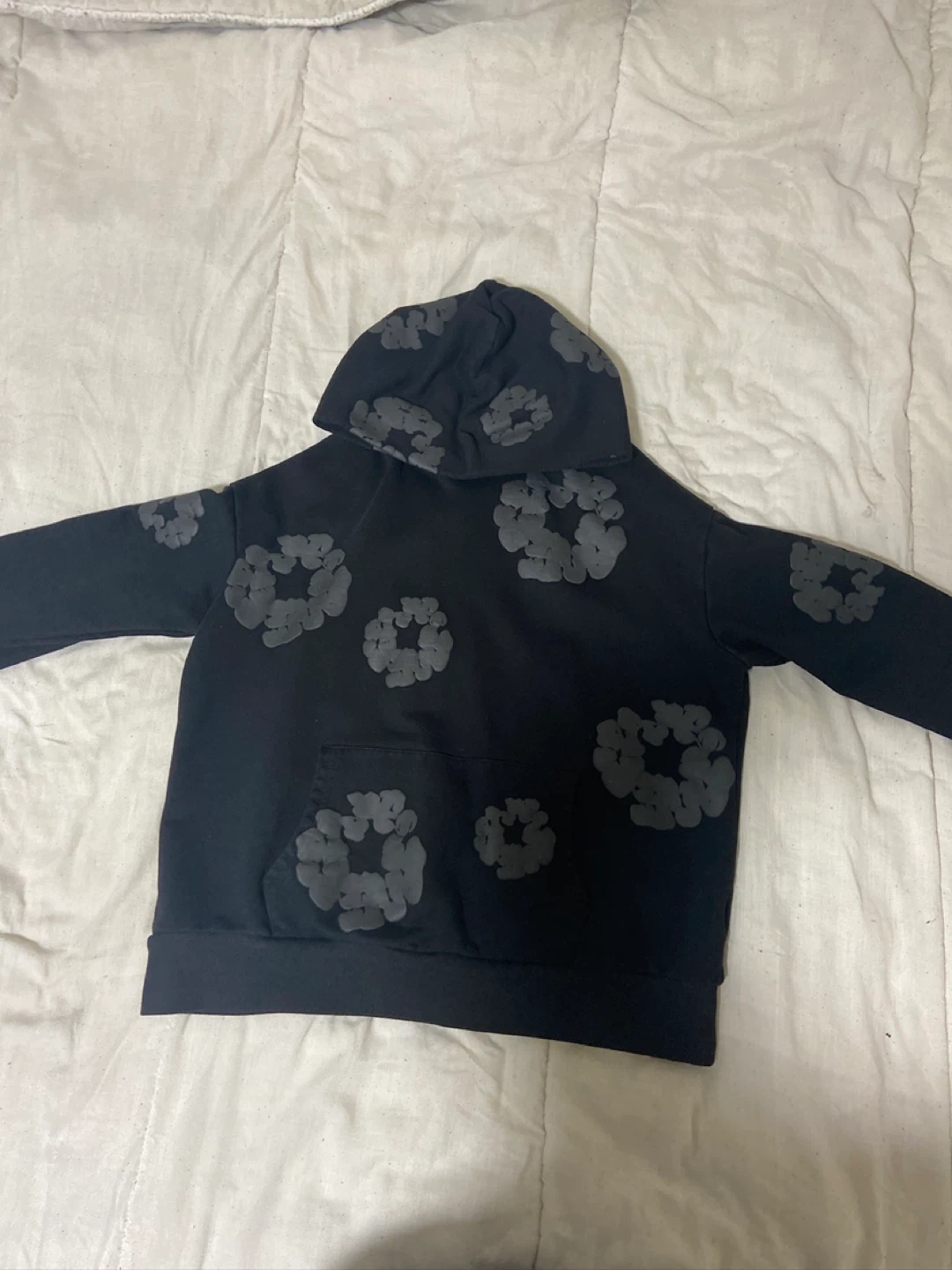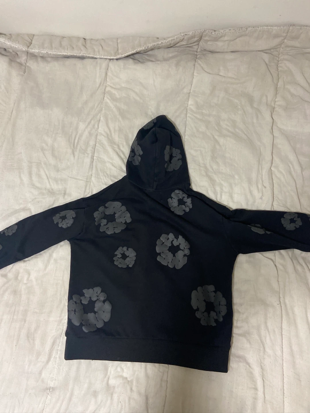 This black hoodie from Denim Tears features a unique floral pattern. It's made in the USA and has a size L tag. Care instructions include hand wash, no bleach, cool iron, do not dry clean, and no tumble dry.