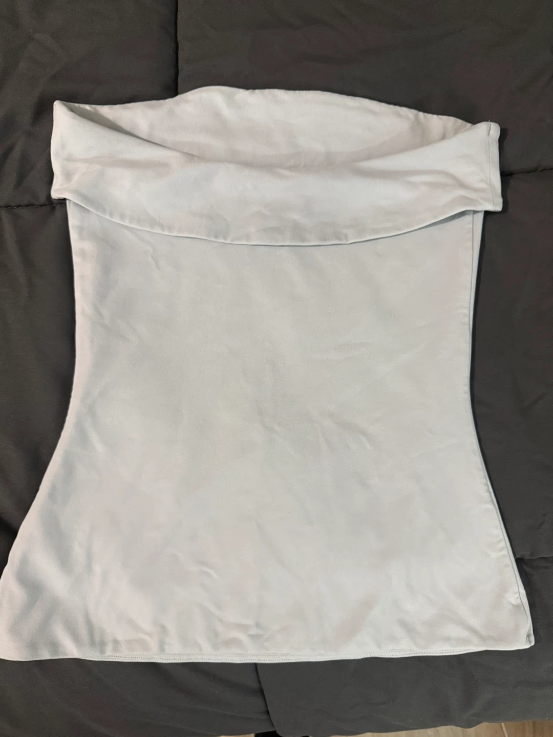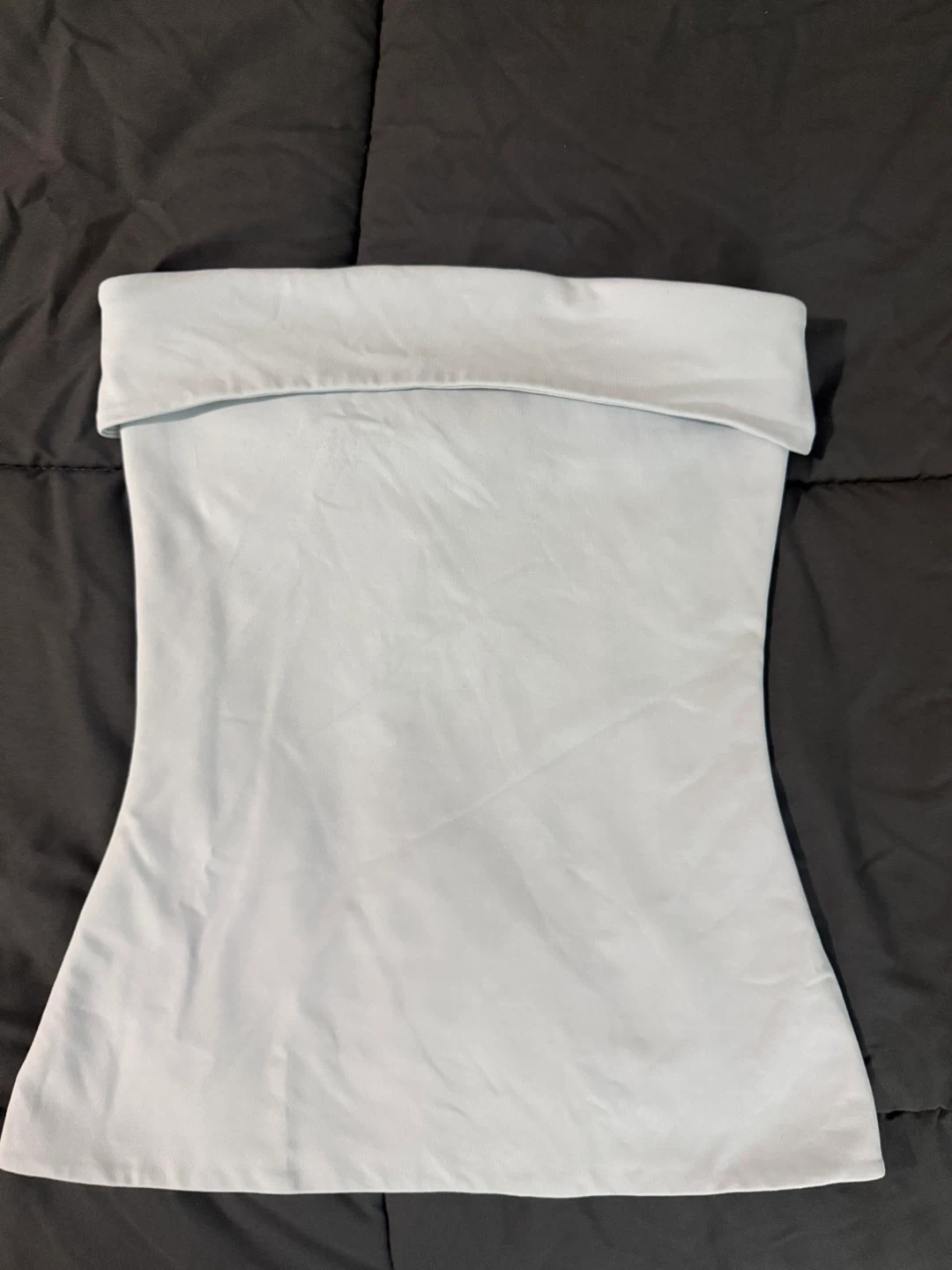A stylish light blue bandeau top from Aritzia. It's made of a soft, stretchy material for a comfortable fit. Perfect for warmer weather or layering!