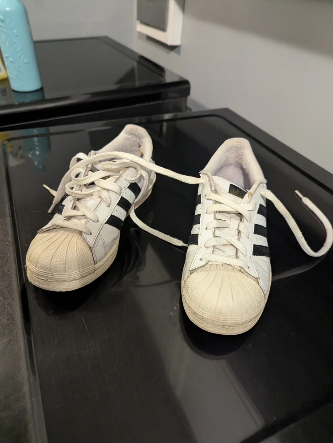 Selling a pair of Adidas Superstar sneakers! They're white with the classic black stripes. They have some signs of wear, but still have lots of life left in them!