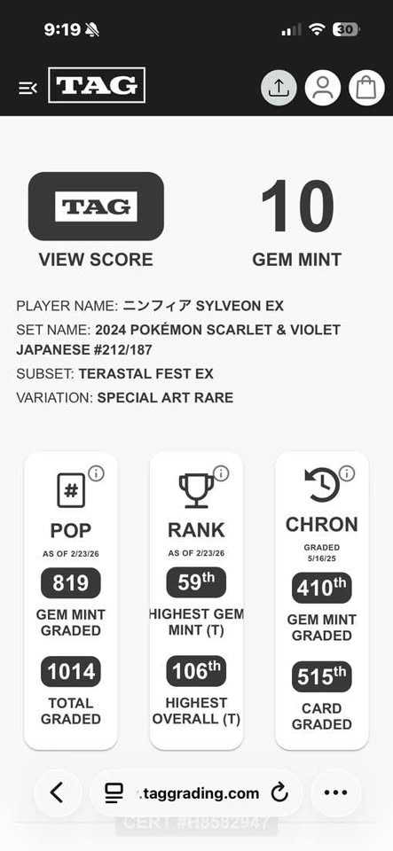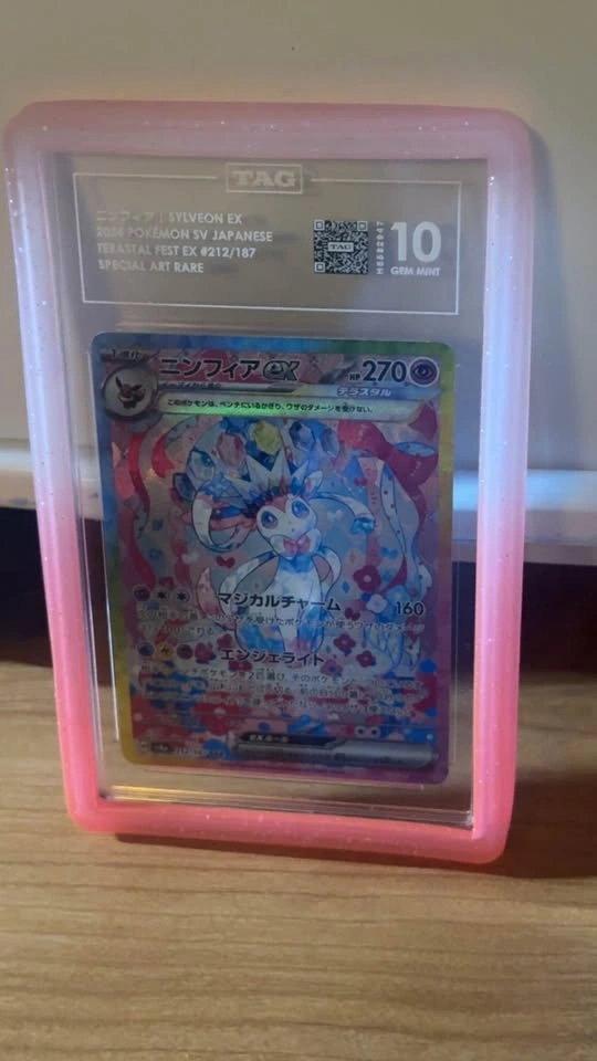 Amazing graded Sylveon EX card! This is a 2024 Pokemon Scarlet & Violet Japanese card, #212/187 from the Terastal Fest EX subset. Special Art Rare variation. Graded by TAG as a perfect 10 Gem Mint. Super high grade, pop is 819 Gem Mint graded. Rank is 59th highest Gem Mint. Grab this one for your collection!