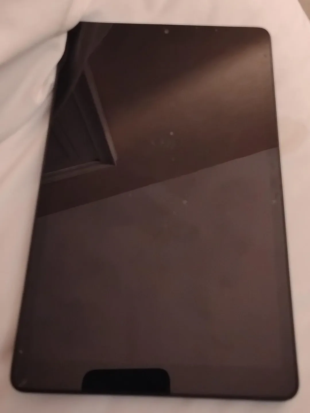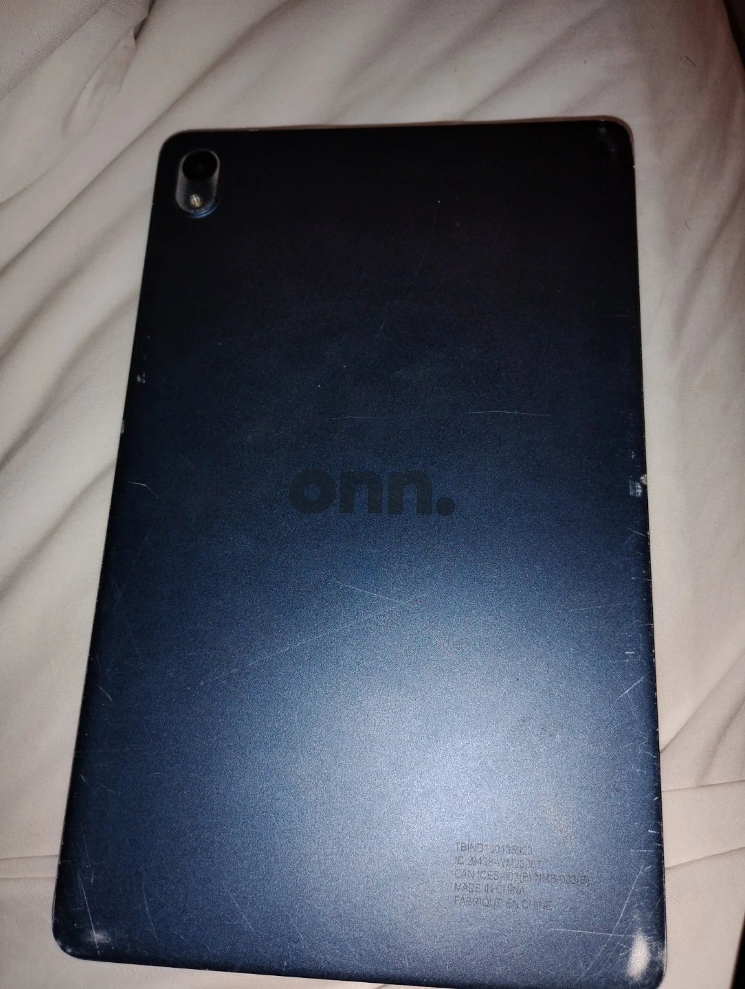 onn. tablet for sale. It's a dark blue colour. This device is great for everyday use and browsing. It has a camera on the back. The screen is cracked but it's still functional.