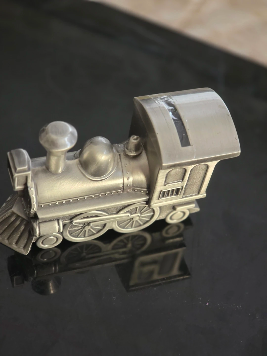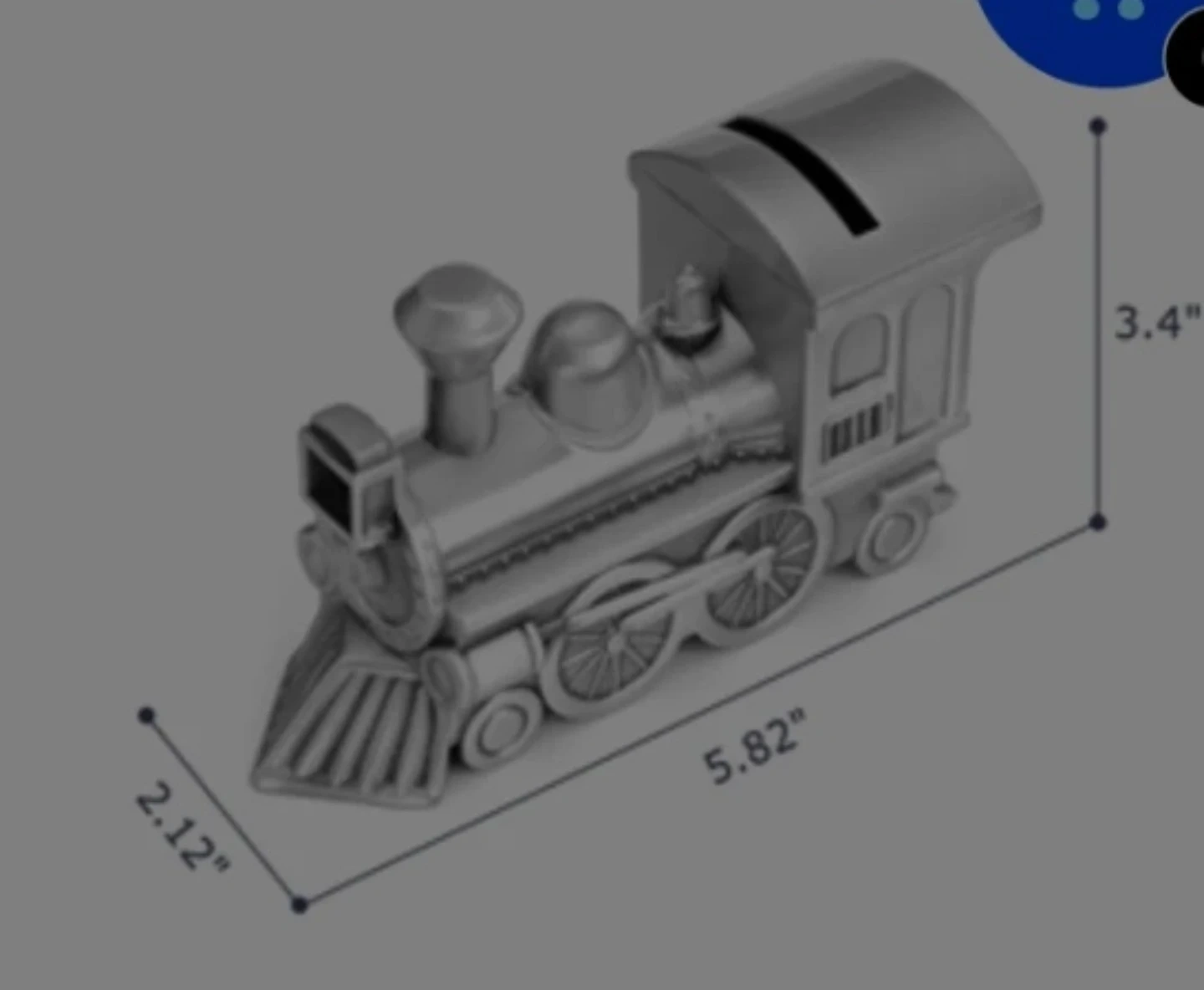 The item is a train-shaped money bank, often referred to as a "train piggy bank" or "locomotive still bank".