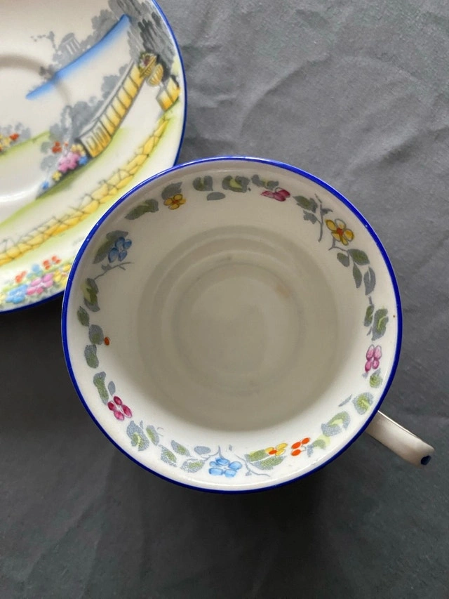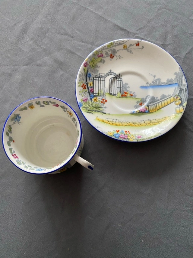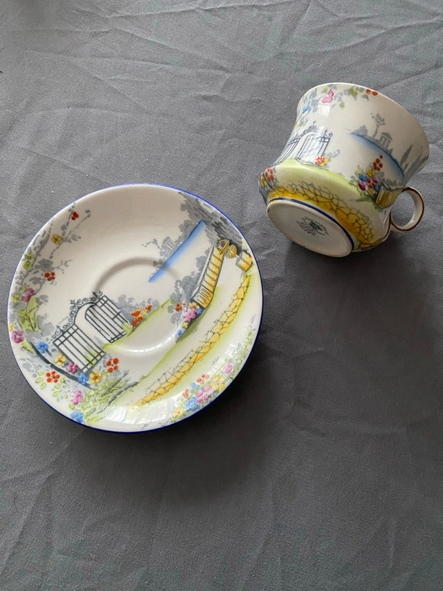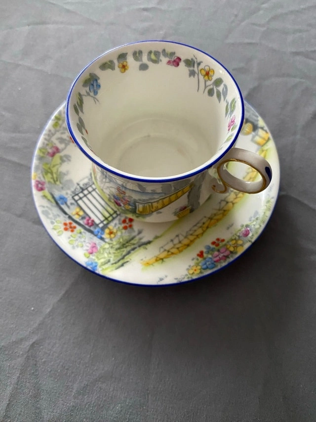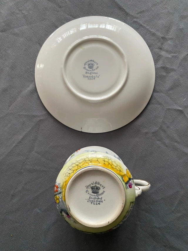 This is a used Royal Albert Crown China teacup and saucer set in the Rosedale pattern, showcasing a charming vintage design. The set features delicate floral patterns and a scenic garden motif, perfect for collectors or those who appreciate fine china. Being a used item, it has some signs of wear, but is generally in good condition. Key features include: * Brand: Royal Albert * Pattern: Rosedale 7324 * Material: Bone China * Origin: England