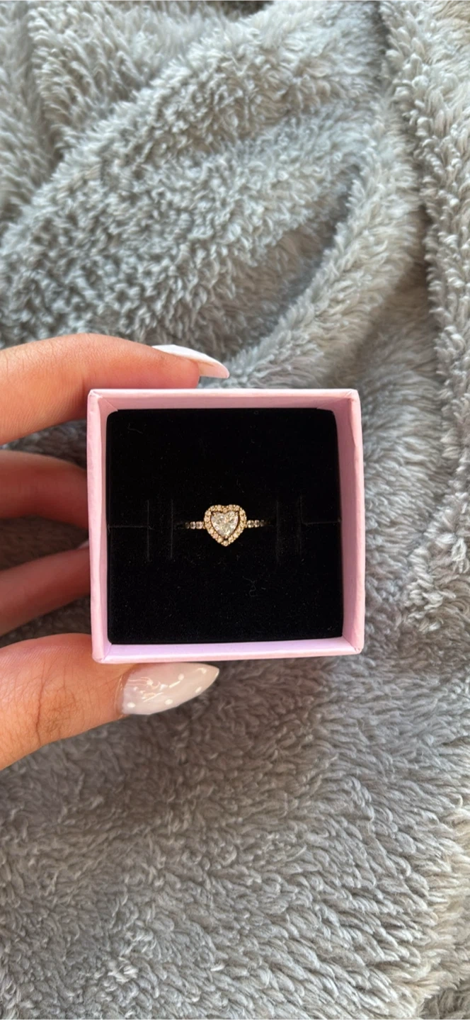 A lovely Pandora ring with a heart-shaped stone, surrounded by smaller stones. It's made of gold-toned metal. Comes with its original Pandora box!
