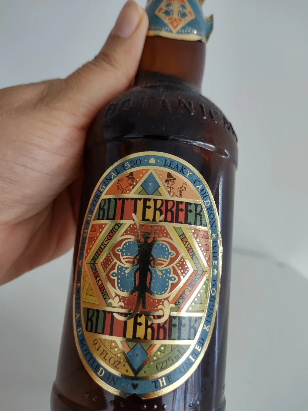 A bottle of Butterbeer from the Leaky Cauldron. This is a 275 ml empty bottle of Butter beer from the iconic Harry Potter and the cursed child show.