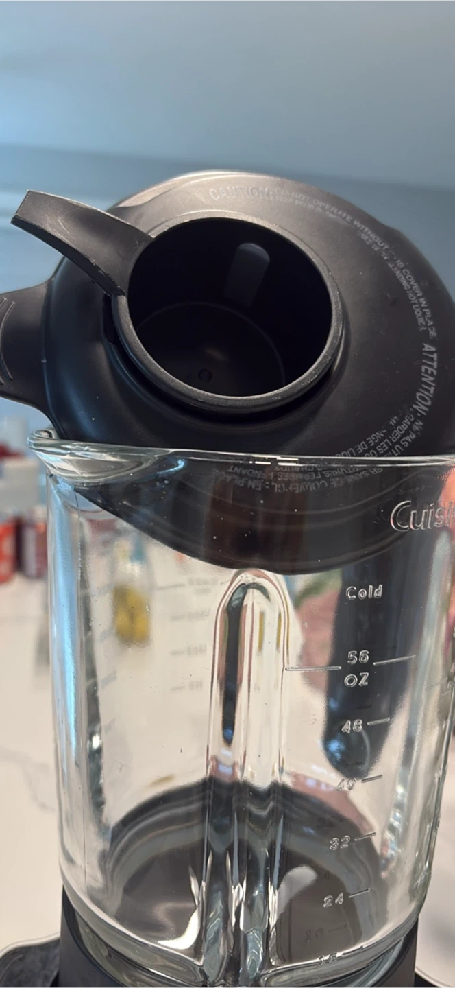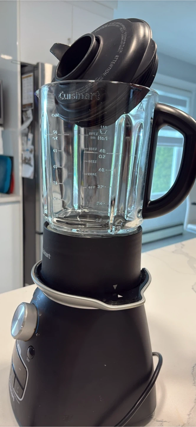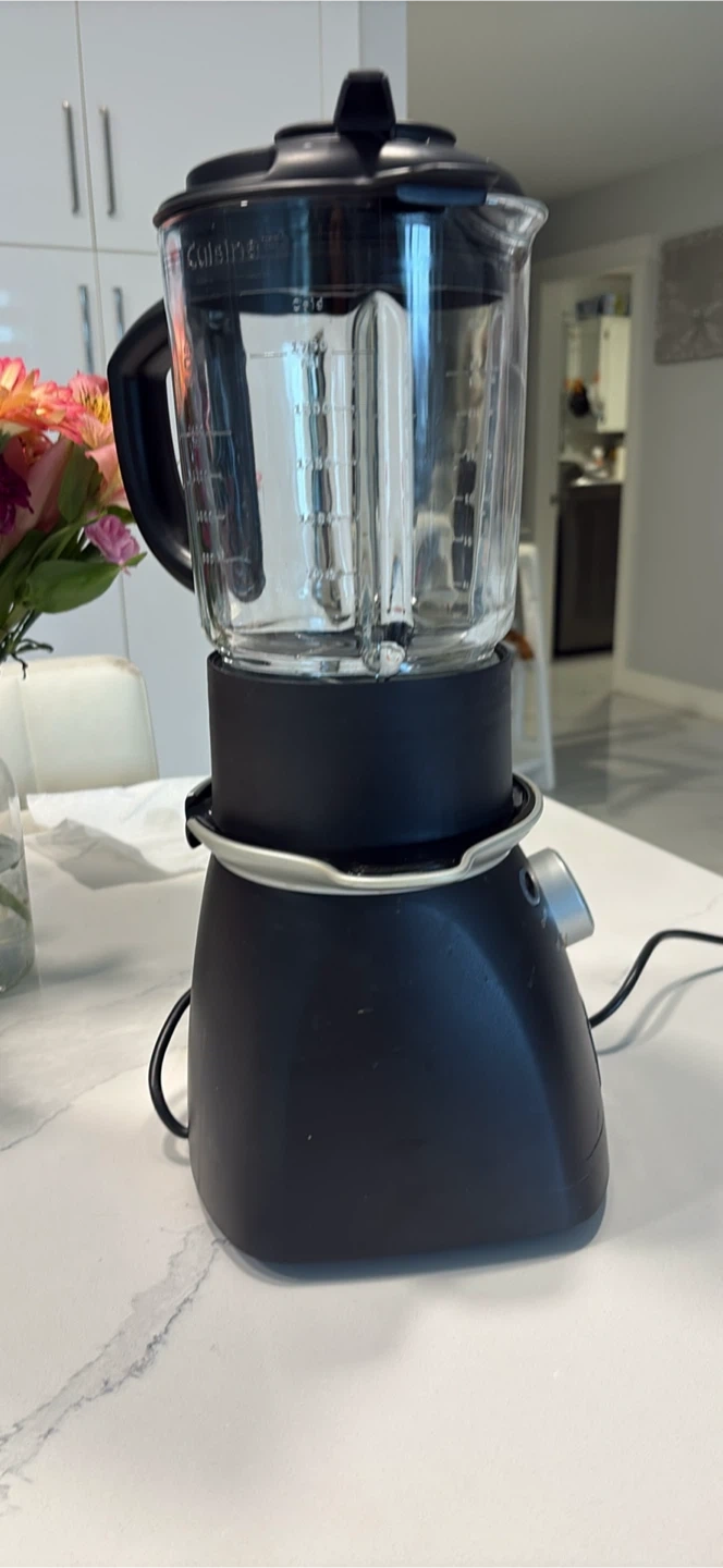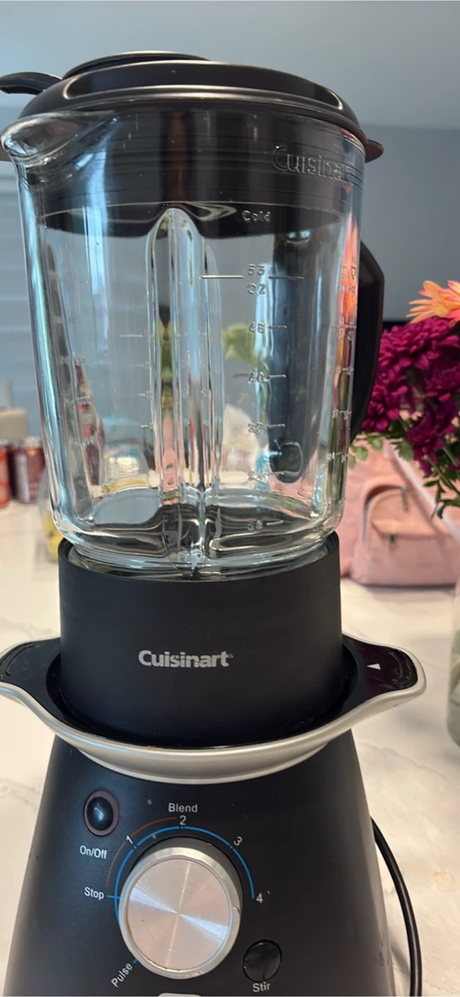 Glass pitcher blender with multiple speed settings and a pulse function. Pitcher has measurement markings up to 56 oz. Comes with a black lid.