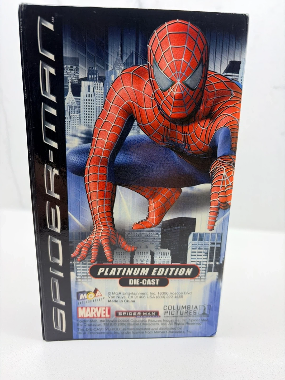 This is a Spider-Man Platinum Edition die-cast vehicle in 1:64 scale. It comes with a collectible film still booklet inside. This would be a fun addition for any Spider-Man fan or collector!