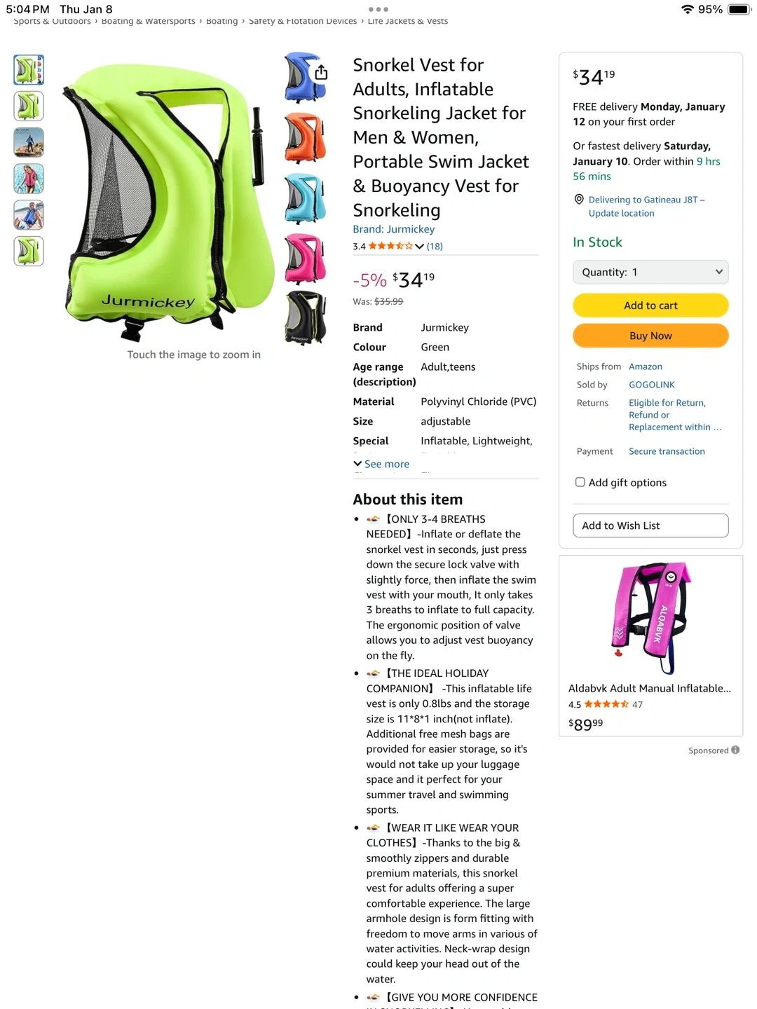 This is a unisex Jurmickey inflatable snorkel vest, perfect for adults and teens! It's highlighter green and adjustable, fitting weights from 90 lbs to 240 lbs. It's made of polyvinyl chloride (PVC) and is lightweight, durable and portable for easy travel.