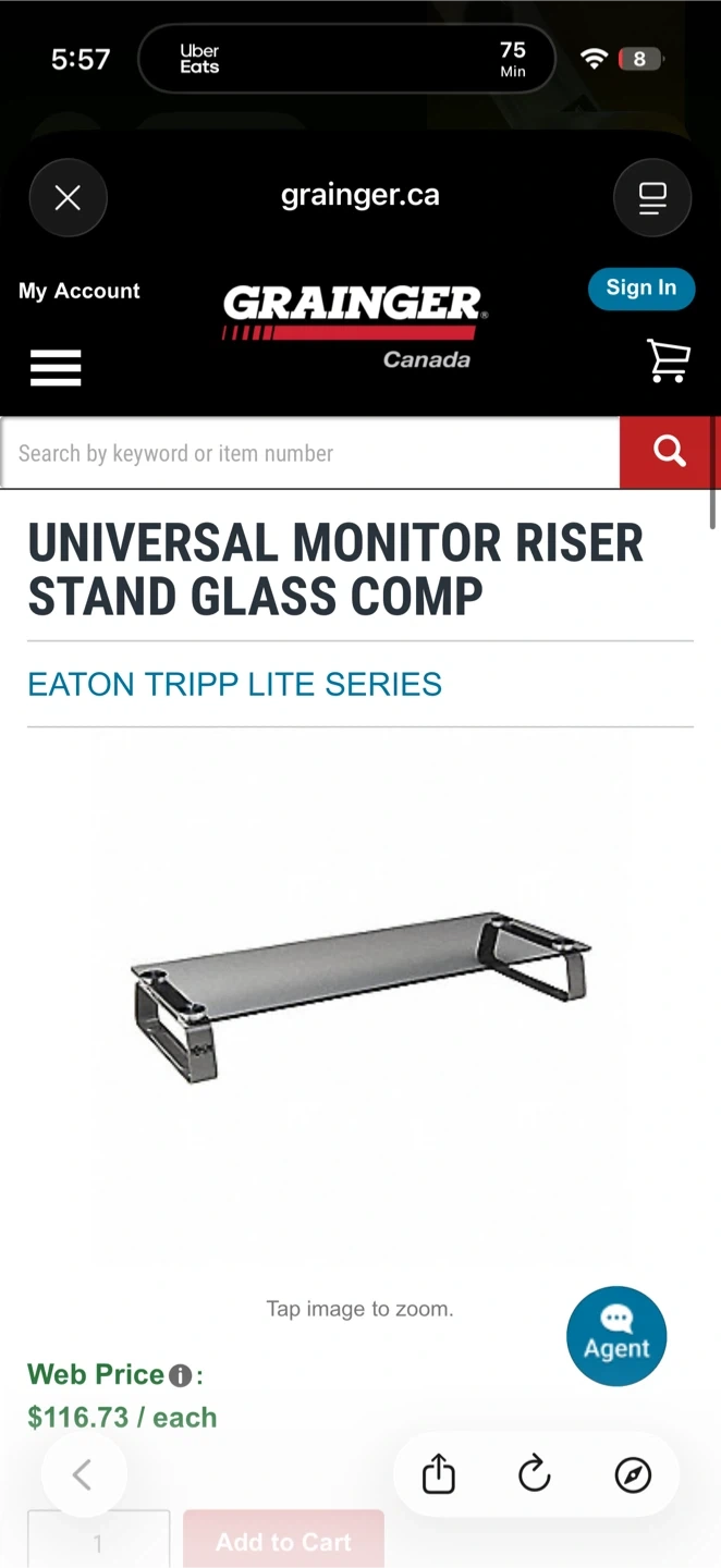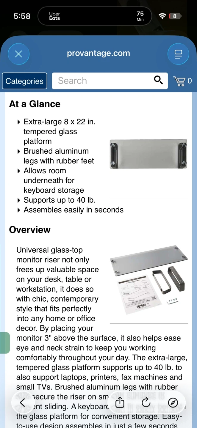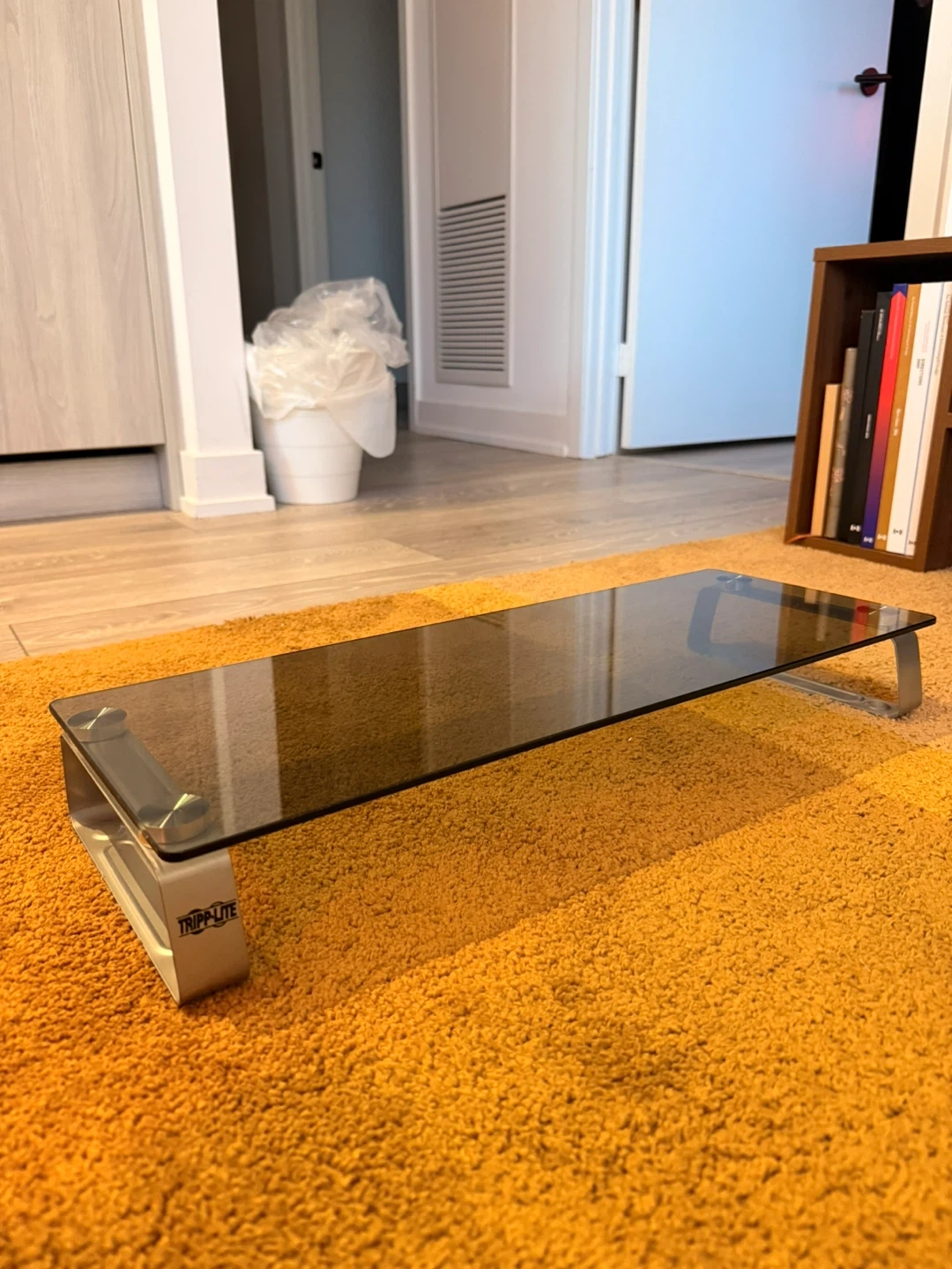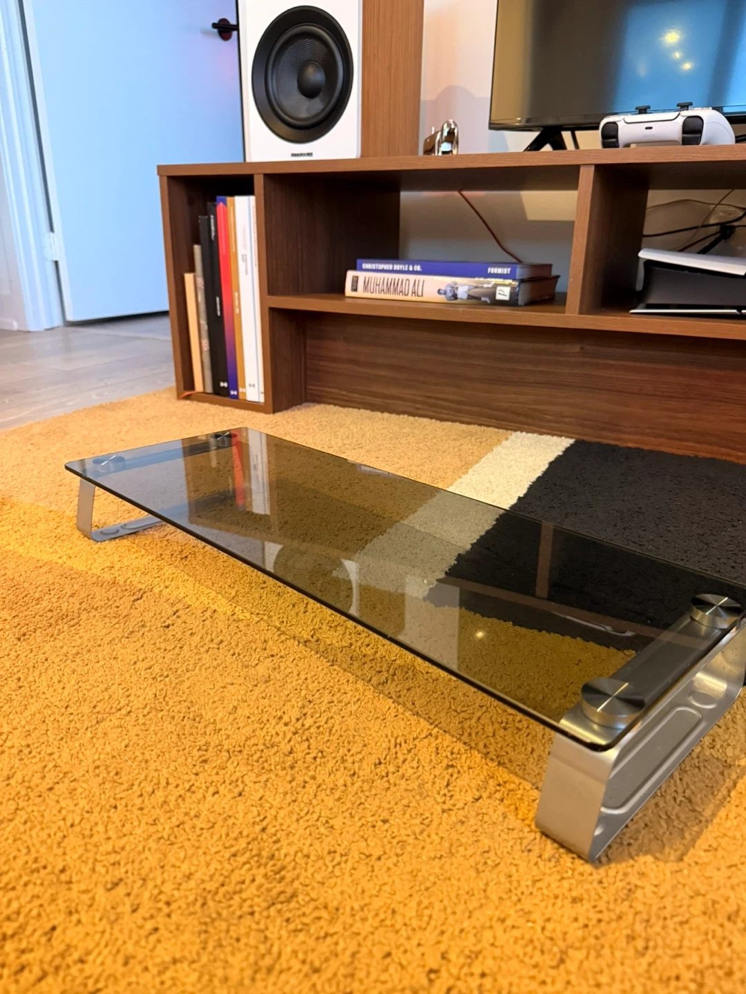 Tempered glass monitor riser with brushed aluminum legs. Provides extra space for keyboard storage underneath. Supports up to 40 lbs.
