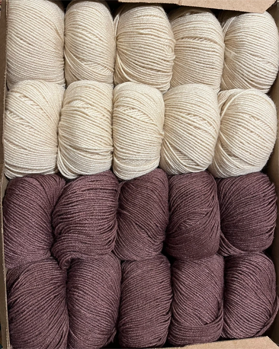 This is a lot of 10 skeins of yarn, with ten in a creamy off-white colour and ten in a deep plum shade. The yarn appears to be a blend suitable for knitting or crocheting projects. These colours would be great for creating handmade garments or home decor items.
