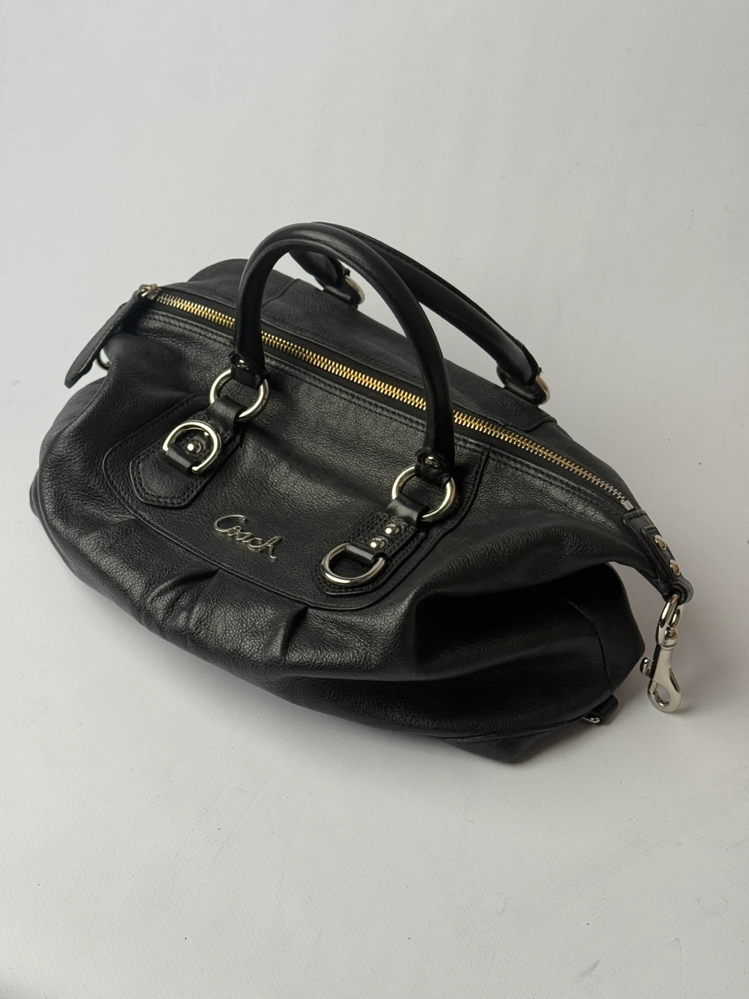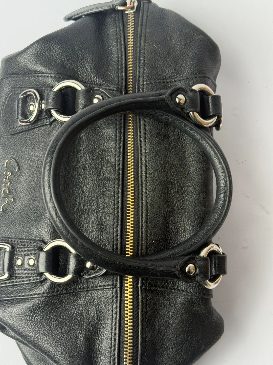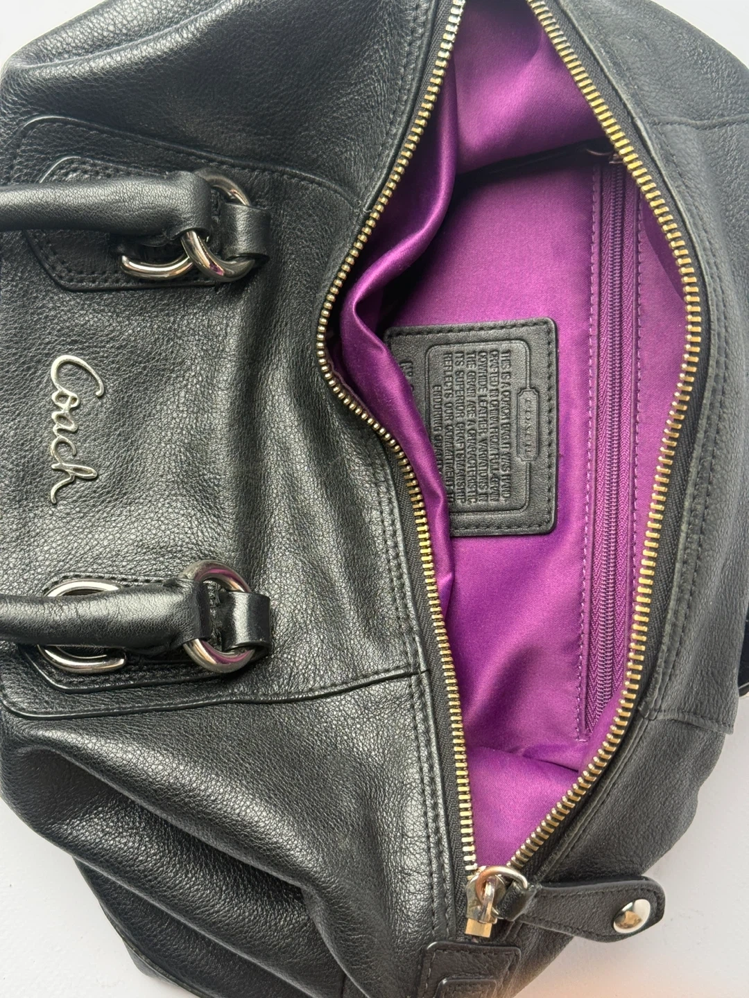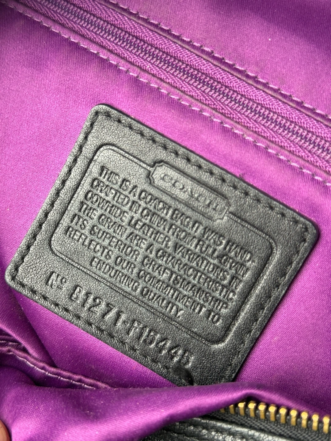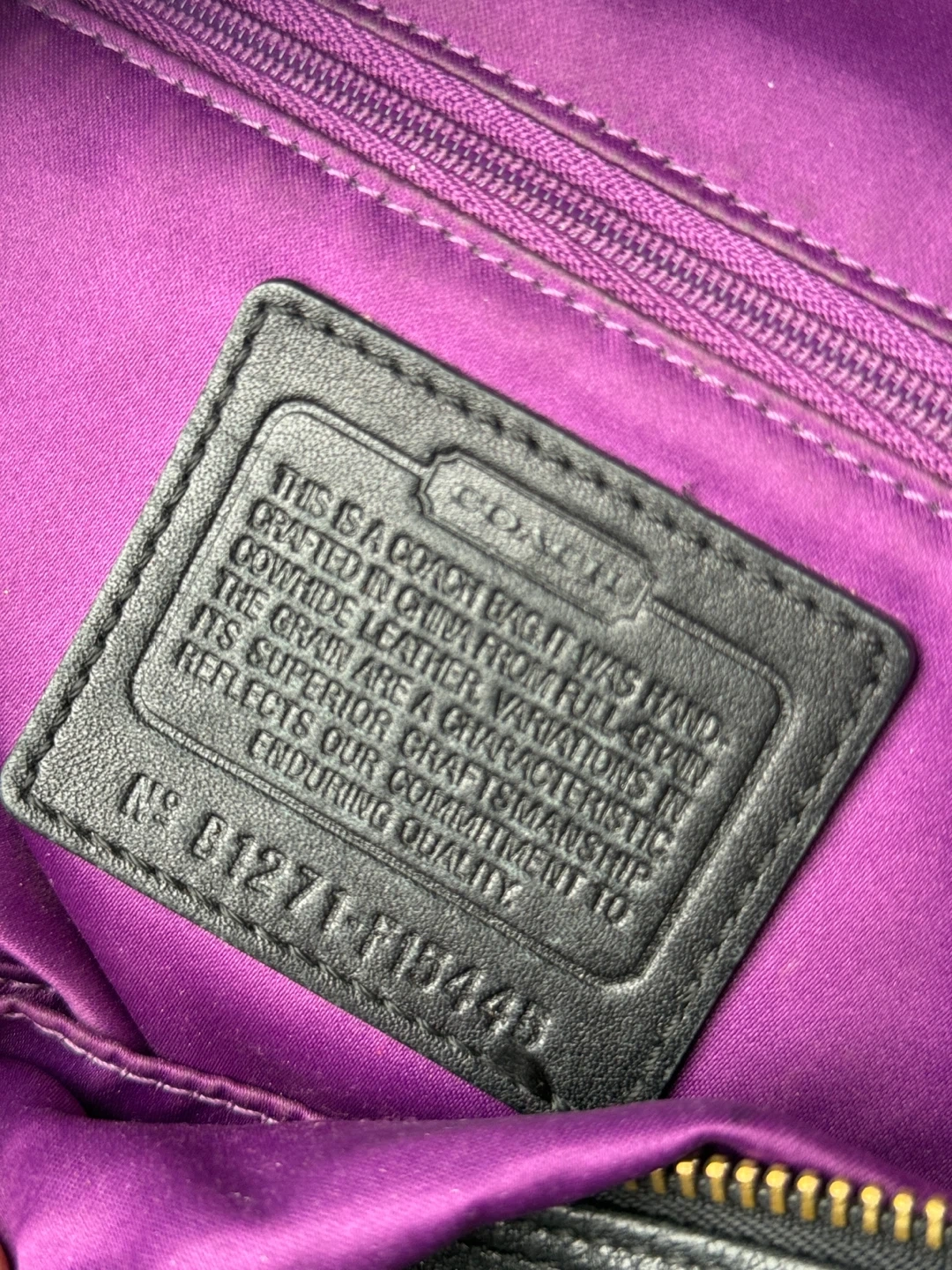 This is a Coach bag crafted from full-grain cowhide leather. It features silver-tone hardware and a vibrant purple satin lining. Interior has a zip pocket and two slip pockets.