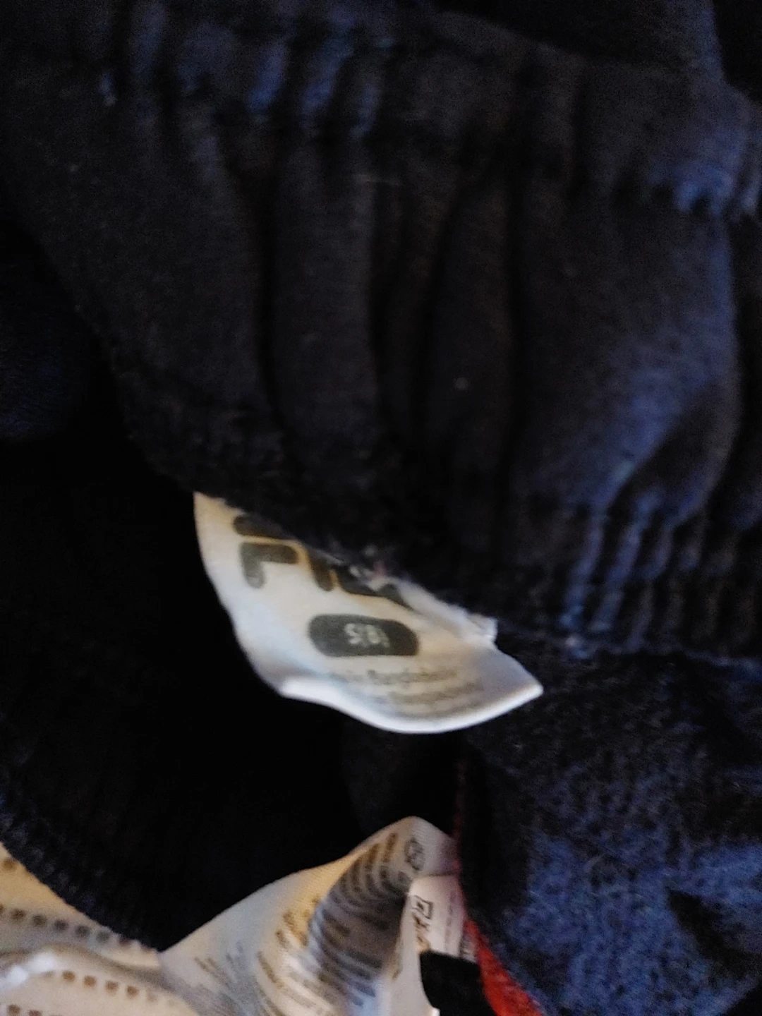 These Fila joggers are a comfy navy blue with a bold red stripe down each side. They feature a drawstring waist for a good fit. Made from a soft material, they're perfect for casual wear.