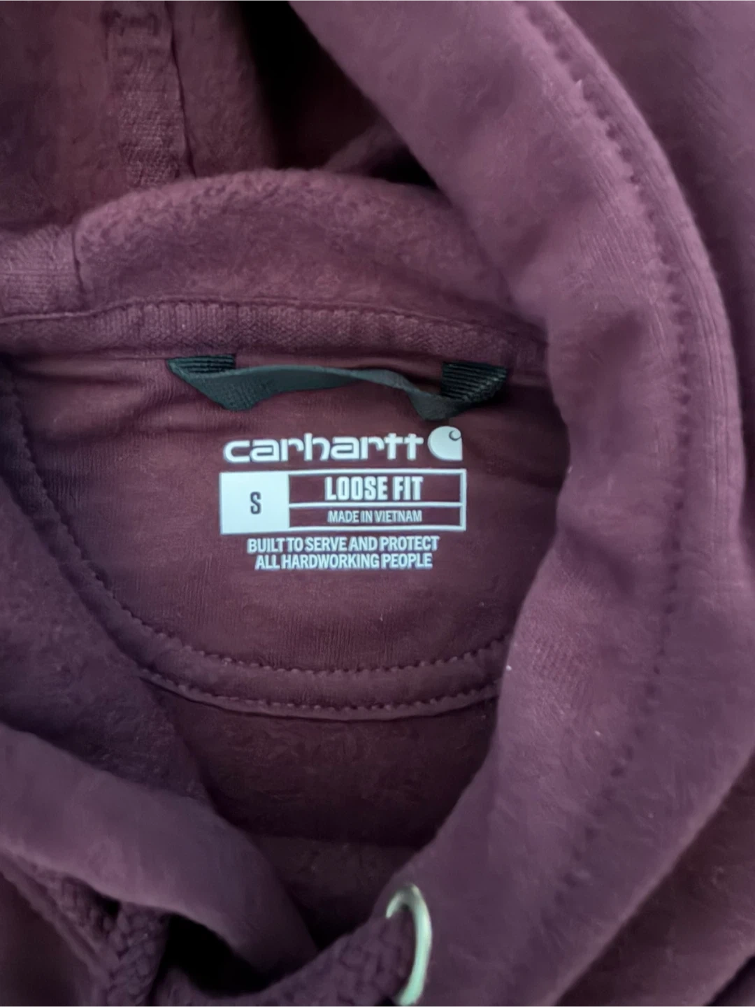 This is a Carhartt hoodie in a loose fit, size small. It's made in Vietnam. Classic Carhartt durability for everyday wear!