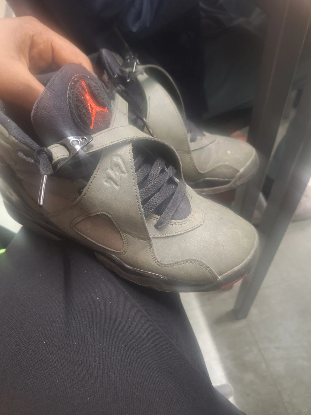Up for grabs are a pair of Air Jordan 8 "Take Flight" sneakers. These kicks come in a size 7Y. They're constructed with a durable, olive green nubuck upper with red and black accents. This model features a unique lacing system and a strap closure.