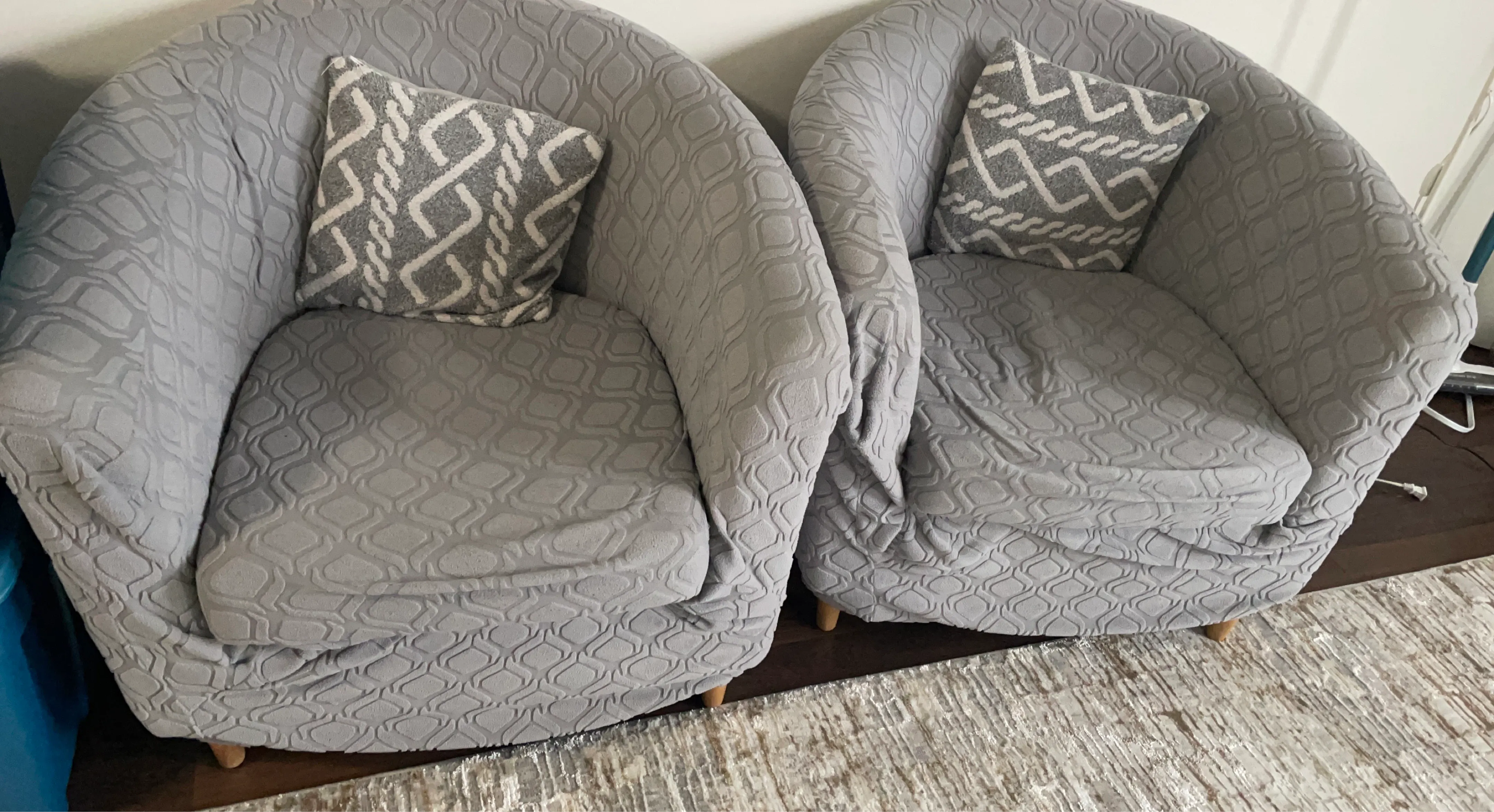 Two comfortable barrel chairs upholstered in a grey fabric with a subtle geometric pattern. Includes two decorative throw pillows with a matching design. Great for a living room or den!