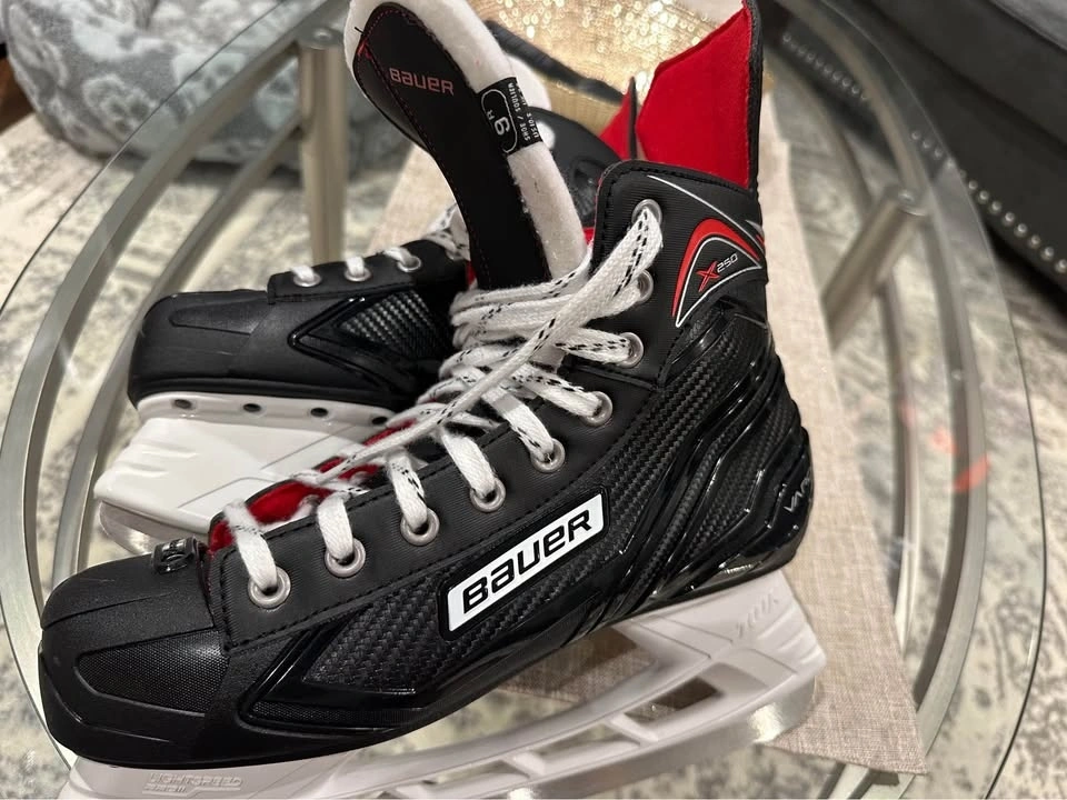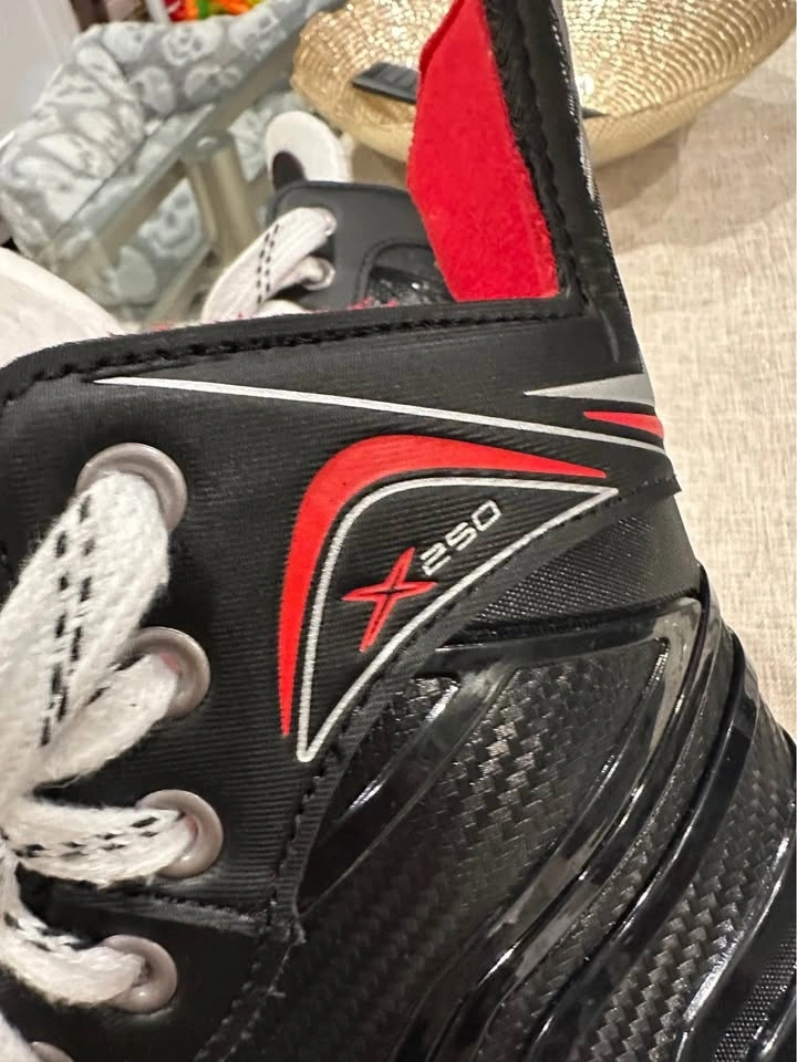 Bauer X250 ice skates, size 9R. Regular fit. The sizing chart indicates these should fit a men's shoe size 10.5 to 11. They have been barely used.