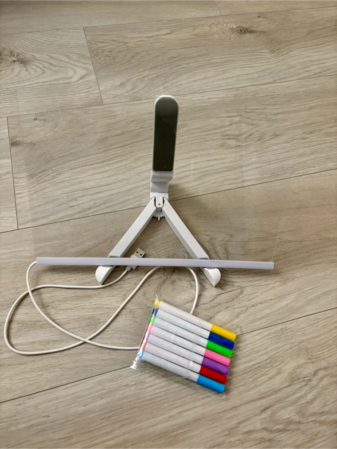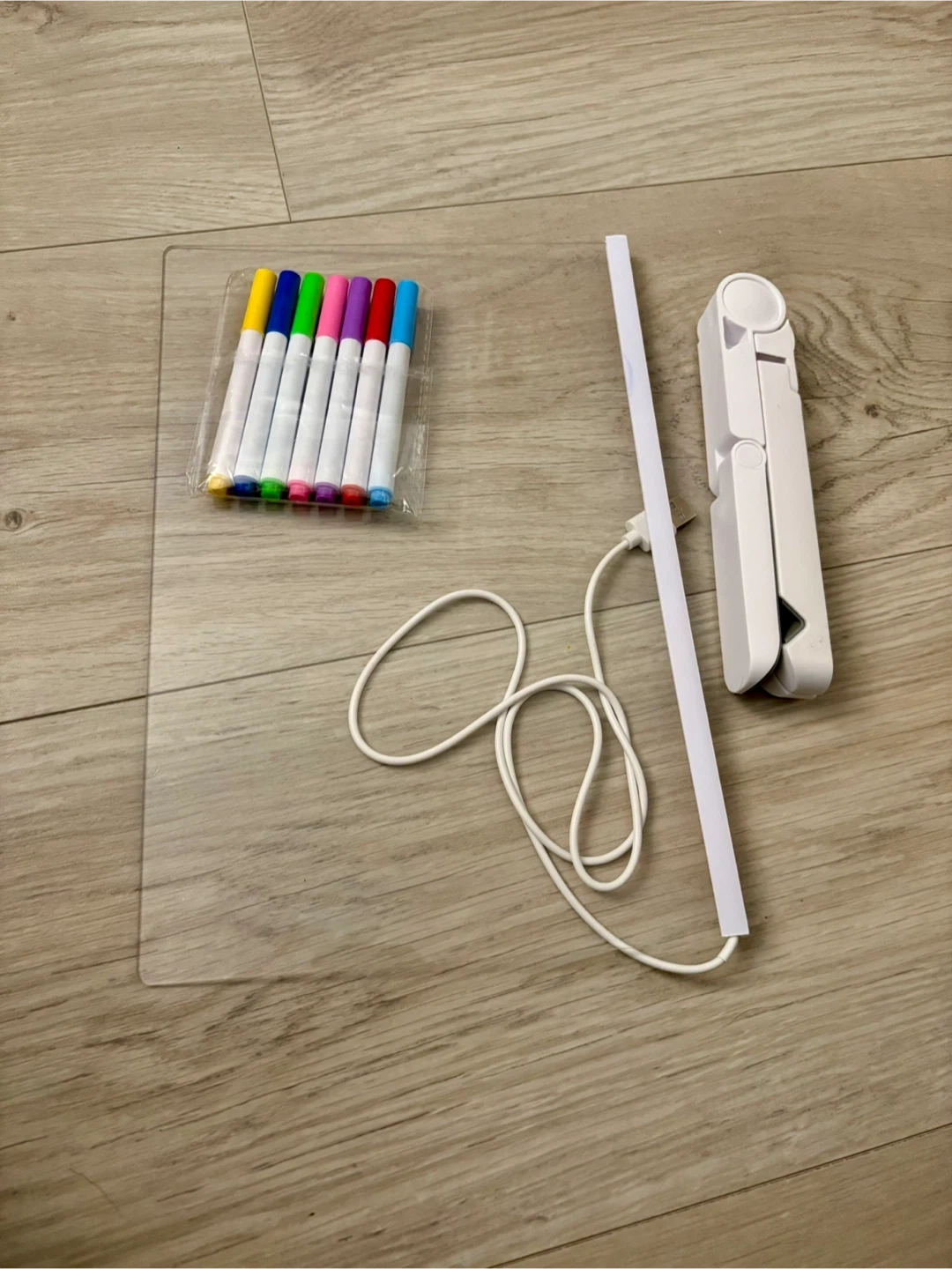 This is an LED dry erase board. It comes with a set of colourful markers and a USB power cable.