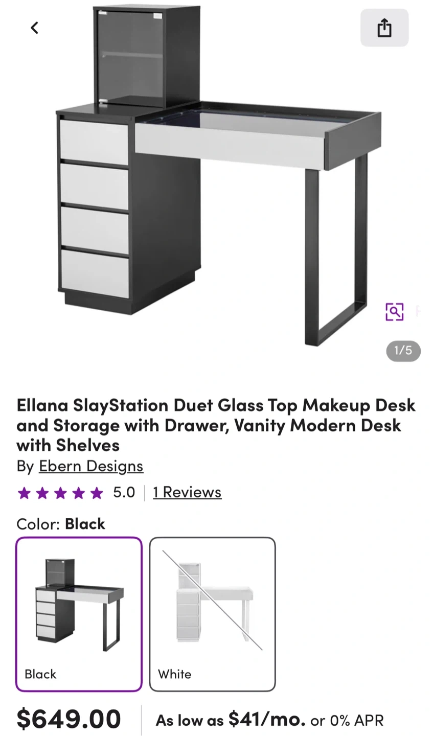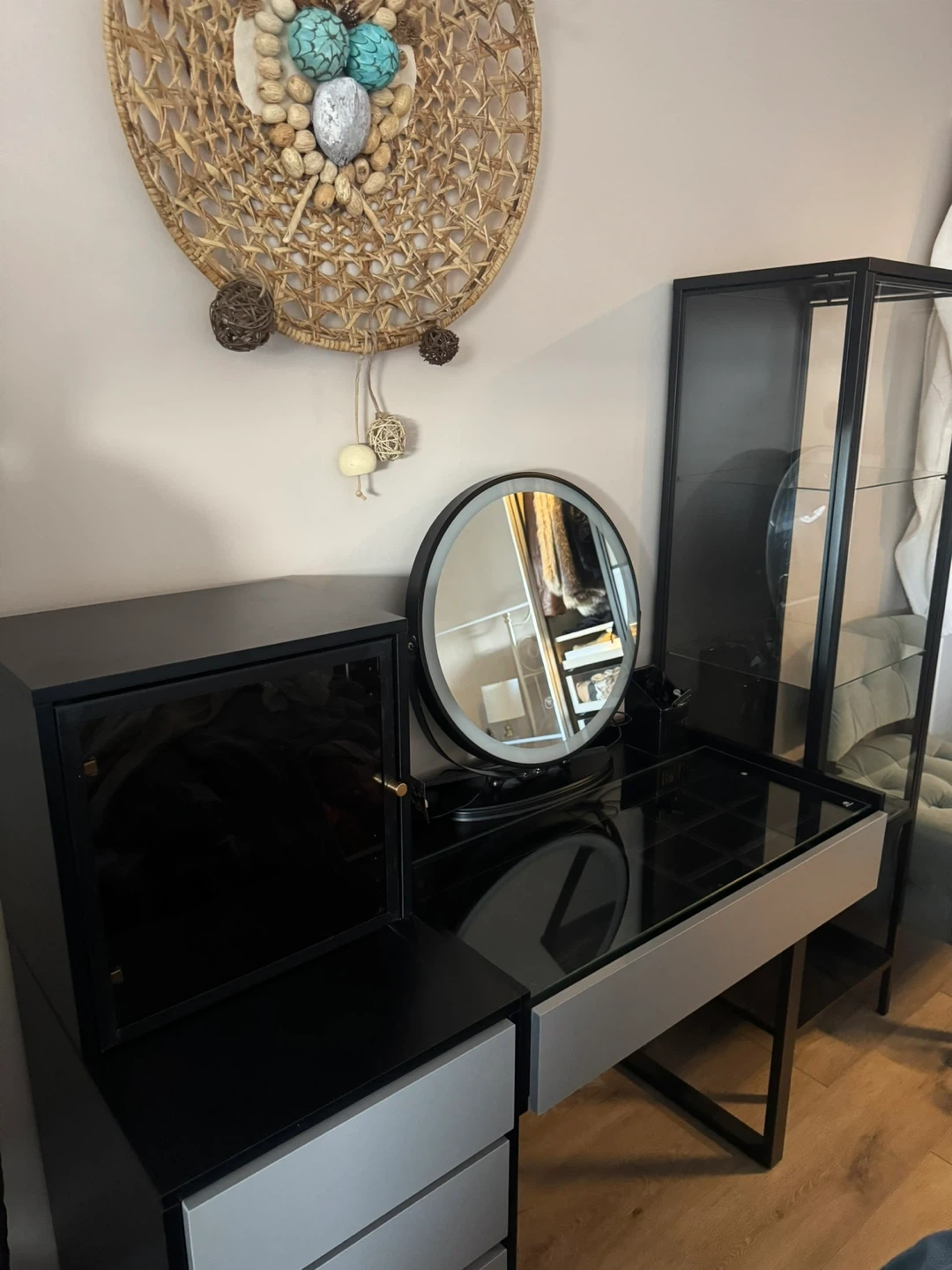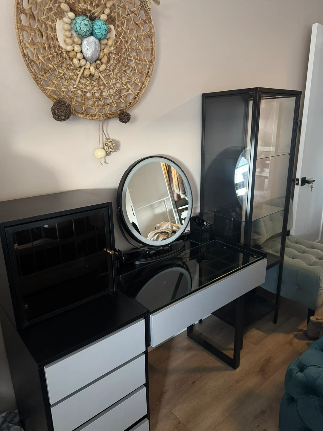 This makeup desk features a glass top with storage and drawers. It's black with white drawer fronts. Dimensions: W46.85" x H47.76" x D21.85". This desk offers ample storage for makeup and accessories.