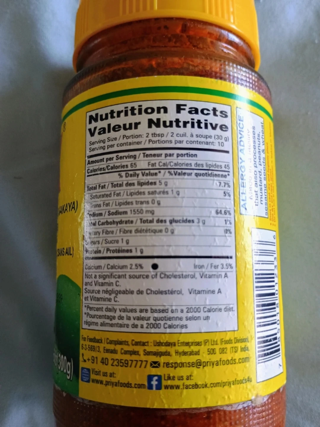 Priya brand mango pickle. It's made with pickled diced mangoes in oil. Contains rice bran oil, iodized salt, mustard, fenugreek, turmeric powder and asafoetida. Best before 2026 AL 30.