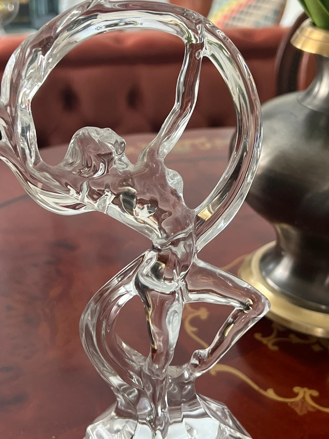 A clear glass figurine depicting a dancer in a graceful pose. It's crafted from transparent glass with a faceted base. This decorative piece would suit any home.