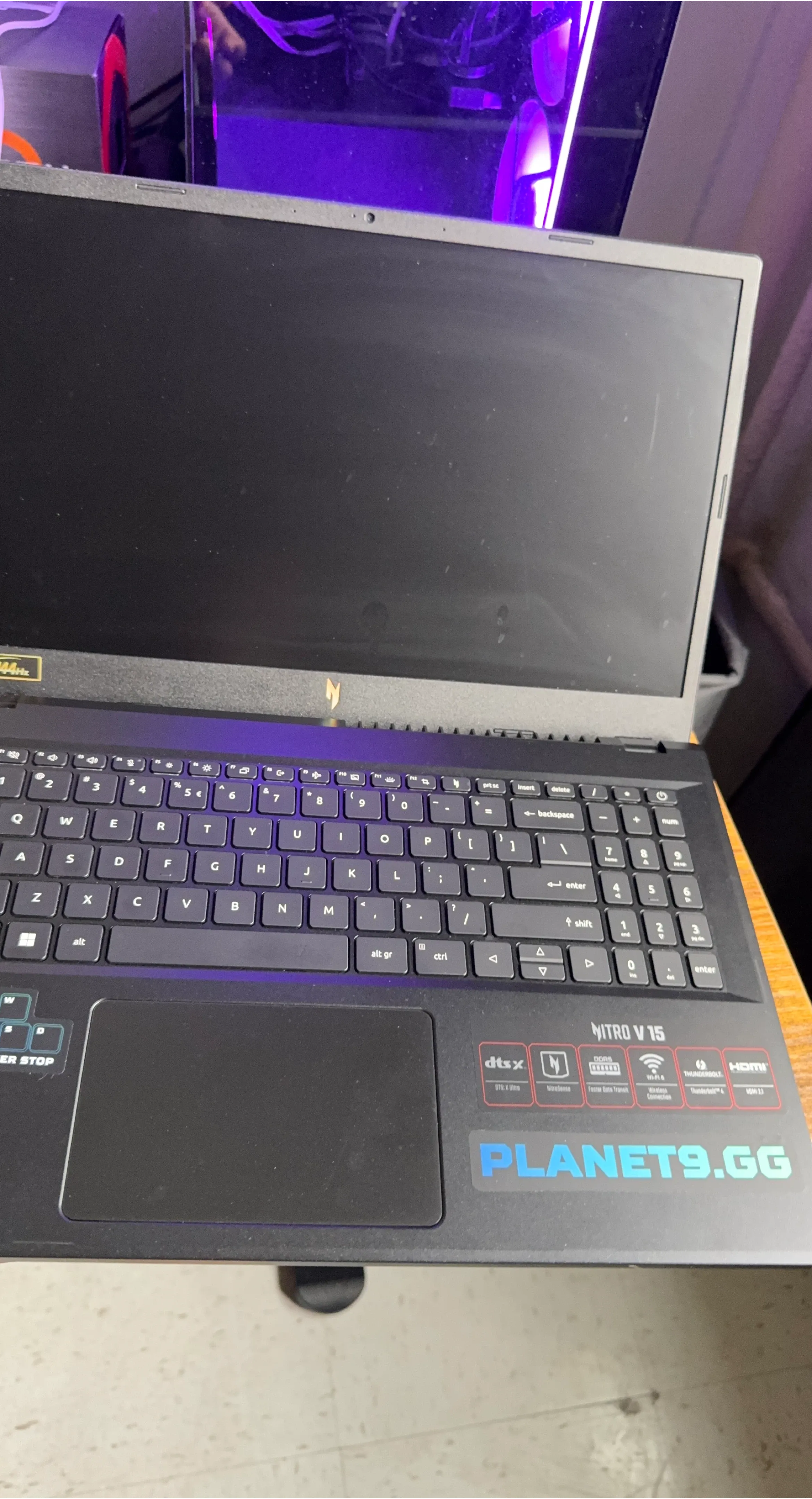 This Acer Nitro V 15 laptop features a 144Hz display. It's equipped with DTS:X Ultra, Wi-Fi 6, and Thunderbolt 4. Comes with Planet9.gg sticker.