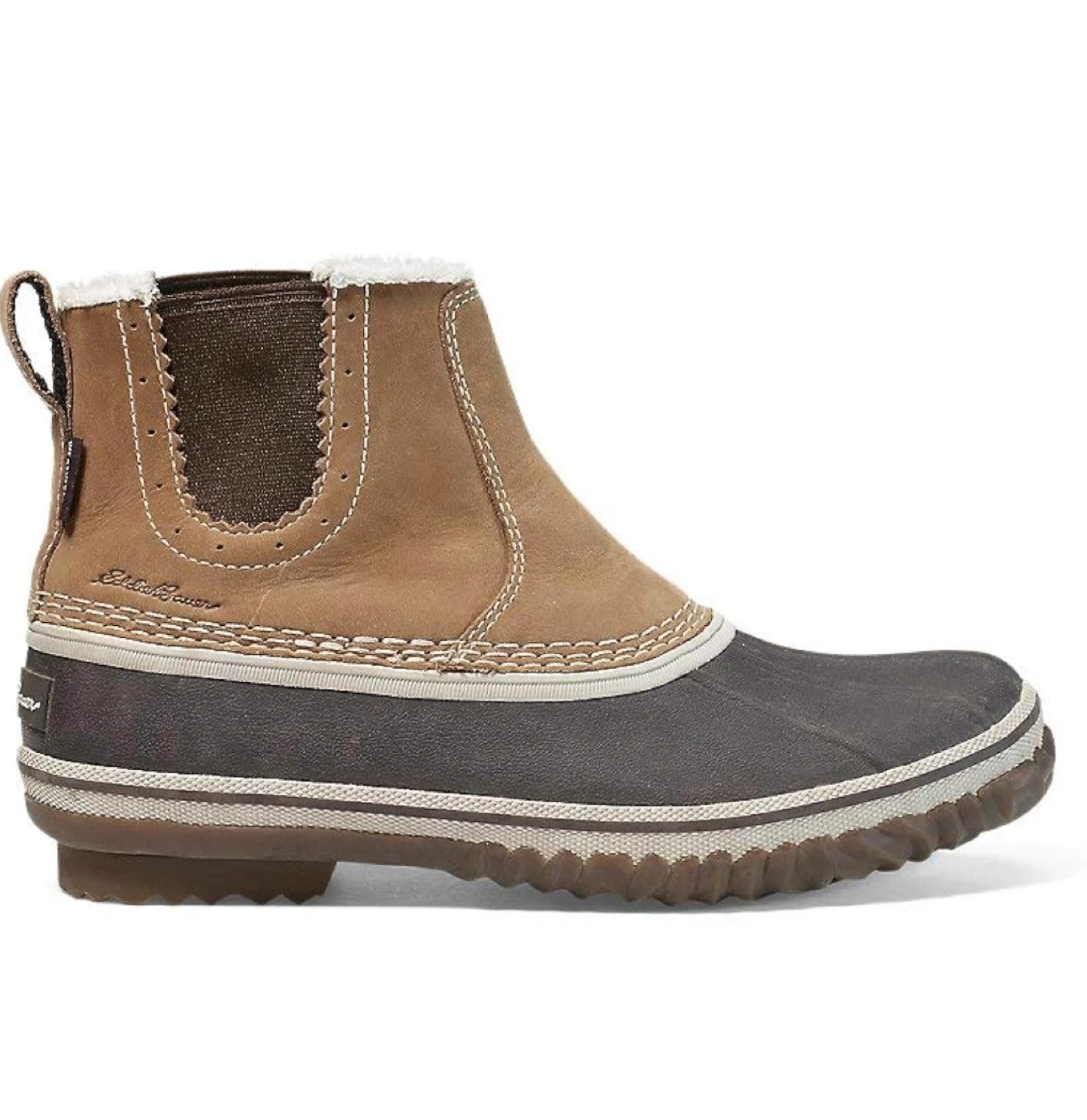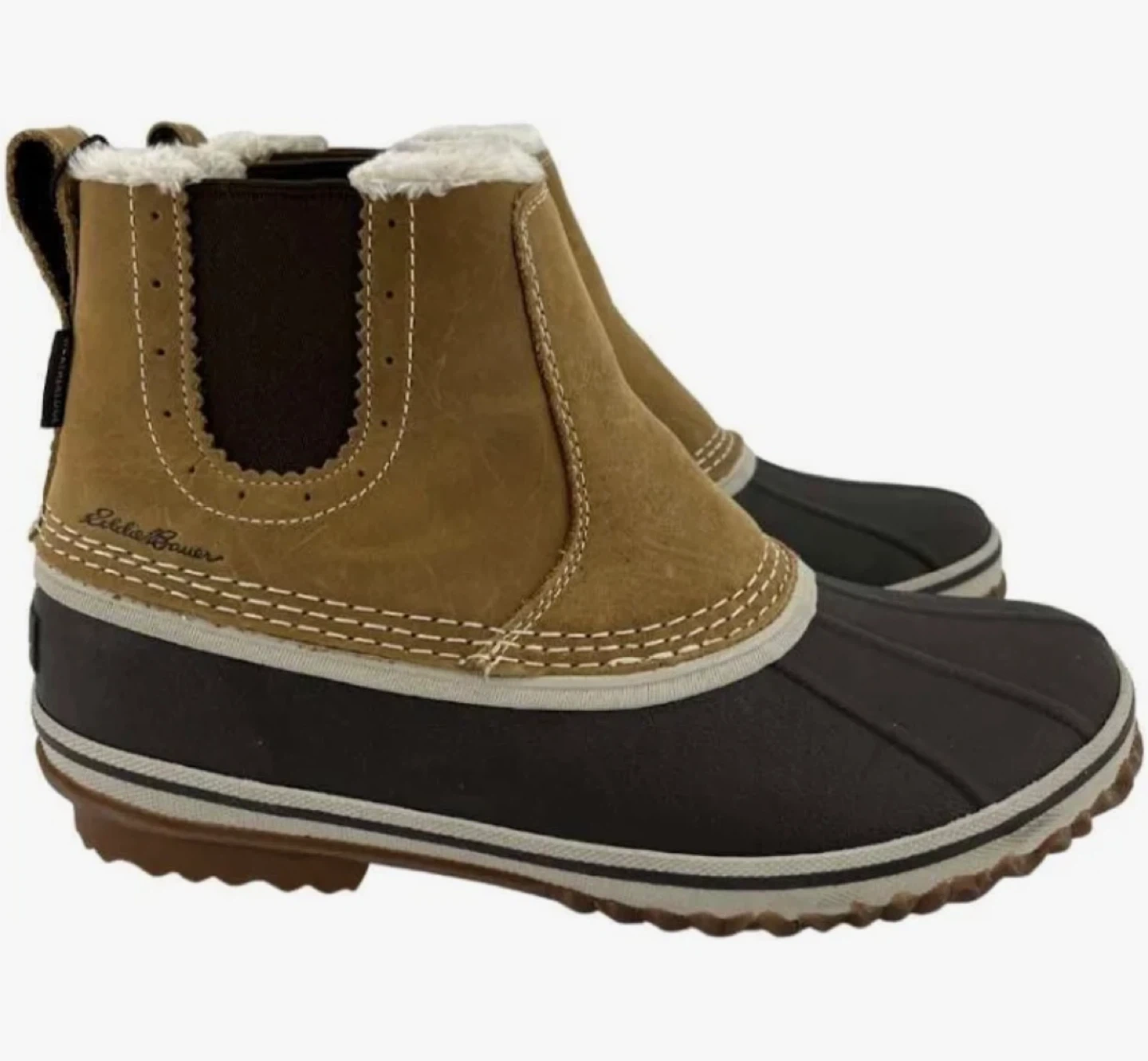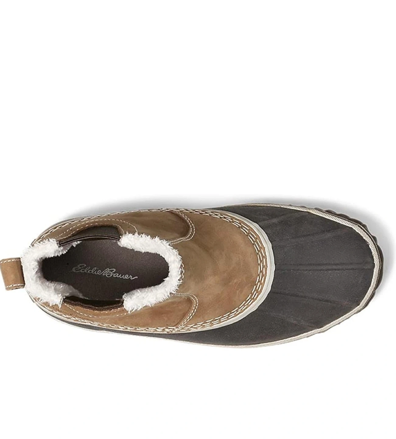 These Eddie Bauer boots are made for staying warm and dry. They feature a water-resistant lower and a cozy, faux-fur lining. Elastic side panels allow for easy on and off. Traction sole for grip. Made with leather and rubber.